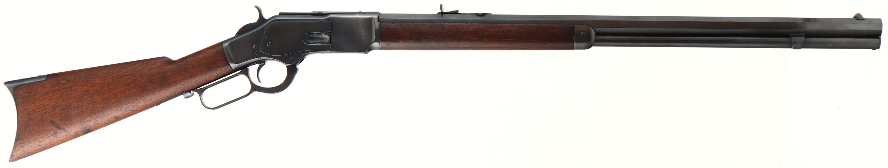 Winchester, Model 1873, 2nd Variation, CAL: 44-40, MFG: 1882, SN: 87244, Lever Action Rifle, 24 1/4'' Octagon barrel, Full mag. The original straight grip wood stock & forend are very good, displaying minor contusions, scrapes & dings. The stocks have possibly been lightly cleaned & reoiled, but carry the original. The metal carries a modern, professionally refinished blue, which rates 90% overall, with minor blemishes, buff polish lines & spotting under the blue. Bore is very good, but with intermittent pitting & spots of roughness amongst proud rifling. The barrel holds an adjustable rear sight & an altered pinched brass blade front sight. Stock carries a sliding trapdoor crescent metal buttplate. Action appears tight & smooth. Antique, No FFL Req. - Value: 1500 to 3000