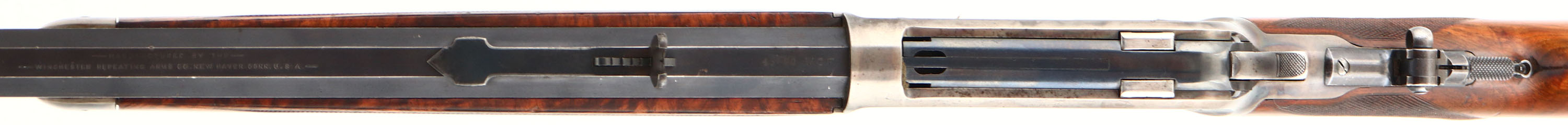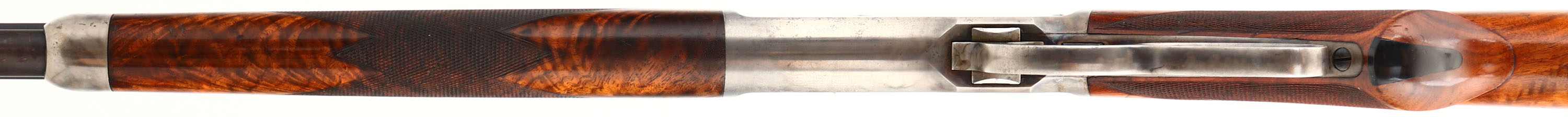 WONDERFUL Winchester, Model 1886 Deluxe, CAL: 45-90 WCF, MFG: 1892 (Antique), SN: 64010, Lever Action Rifle, 26'' Octagon barrel, Full mag. Special Order Rifle. Mounted with fantastic, center crotch, rippled grain American walnut with ''H'' style checkered forearm, serpentine pistol grip stock with a black triangle inlay & a Winchester hard rubber, widow's peak, shotgun style buttplate. The stocks are excellent, with a majority of the original finish remaining & a few small contusions, scuffs & handling marks. The original metal blue finish on the barrel rates 97%, 95% on the mag, with areas of thinning starting to tone to a brown patina. The receiver, lever, hammer, & forend cap are all case-hardened, displaying beautiful case-colors. The sliding bolt retains a full 95% of the original bright blue colors. The sliding bolt retains 97% of its original bright blue. The receiver is fitted with a Lyman adjustable flip-up tang sight, while the barrel carries an original adjustable rear & blade front sights. Bore is excellent, with a couple of spots of roughness. This Special Order deluxe rifle is in excellent high condition & a very collectible case-colored 1886.* Antique, No FFL Req. - Value: 20000 to 30000
