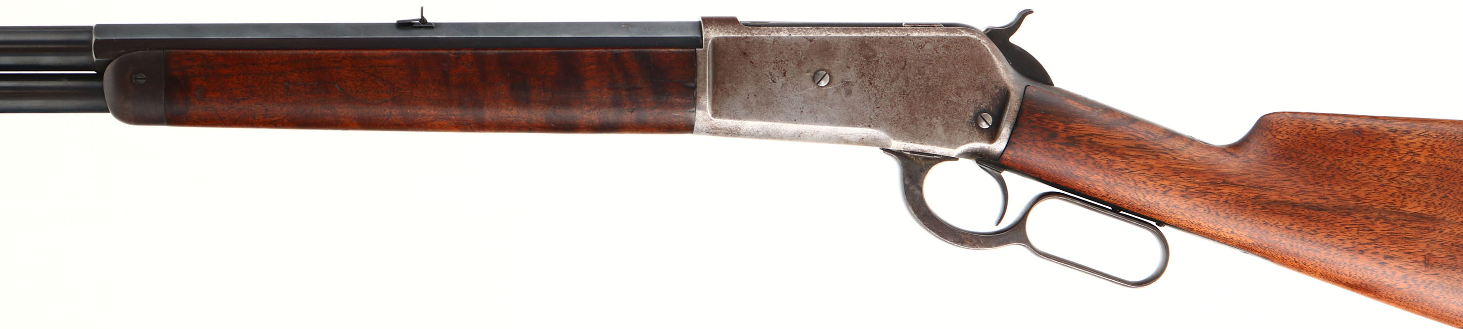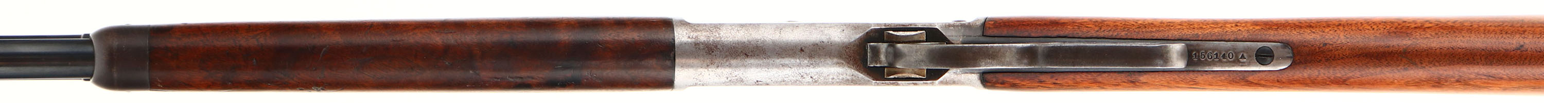 SPECIAL ORDER Winchester, Model 1886, (MATTED BARREL), CAL: 40-82 WCF, MFG: 1918, SN: 156140, Lever Action Rifle, 26'' Half octagon/half round barrel, Full mag. A special order rifle, with unique features. The orignal straight grip stocks are very good. The stock has been lightly sanded & nicely refinished, with a couple of minor spot with filler & a small toe chip that has also been filled. The original forend carries the original finish, with several minor contusions or scratches. The barrel is a special order having a rare full length matted top on the 1/2 octagon 1/2 round barrel. According to a 2007 WACA article on the subject, Winchester records indicate only 206 matted barrel 1886 rifles were produced in all calibers. The high luster metal blue finish on the barrel & mag has been nicely restored & rates 98%, with some light speckling under blue. The receiver, lever, hammer & forend cap are worn mostly gun metal gray, with a thin layer of brown patina. The sliding bolt retains a 85% of its original bright blue. Fitted with a special order two leaf folding rear sight & a small blade front sight. Bore is excellent. Ordered with a Winchester hard rubber, widow's peak, shotgun buttplate. Comes with a Cody Winchester Factory Records Letter, which simply confirms no records for this rifle are available. This rare special order rifle, with a very nice overall appearance. FFL or C&R Req. - Value: 3000 to 6000