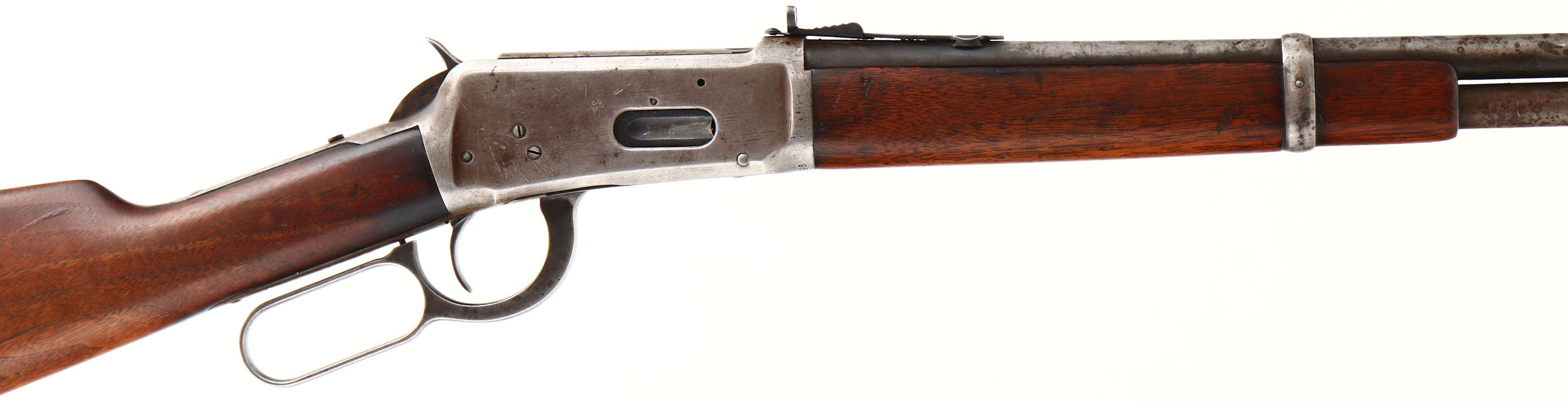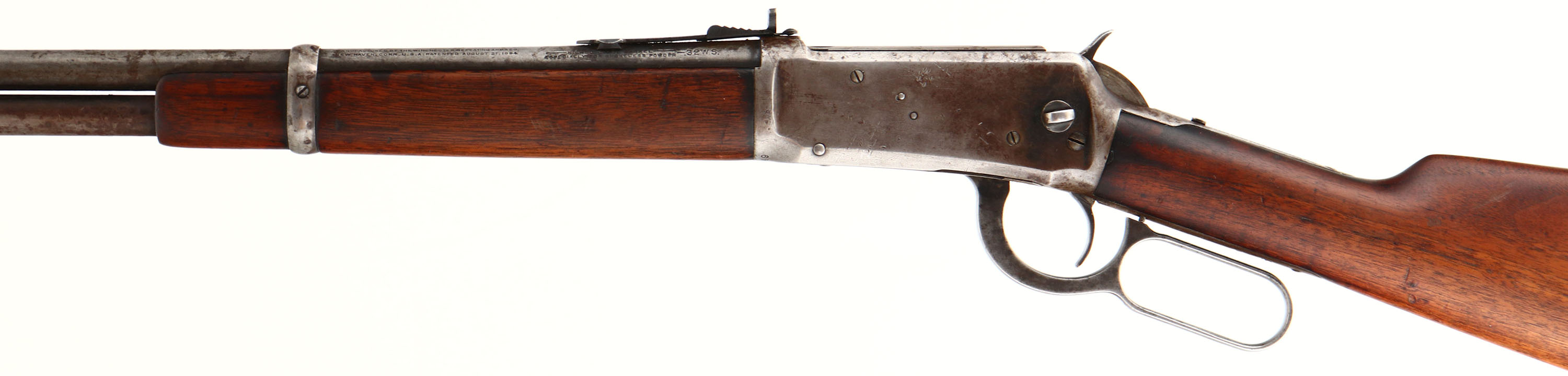 Winchester, Model 94 SRC, CAL: 32 W.S., MFG: 1925, SN: 957949, Lever Action Rifle, 20'' Round barrel, Full mag. The original straight grip wood stocks are good & solid, as lightly sanded & reoiled. The stock has an edge chip at the heel, & both has minor contusions, scrapes & dings. The metal blue finish has worn to a gun metal gray, with a thin, spotty layer of brown patina. Bore is very good, moderately rough, with proud rifling. The barrel holds a replaced adjustable rear sight & block elevated blade front sight. Stock carries a carbine style metal buttplate. Saddle ring is missing. FFL or C&R Req. - Value: 400 to 800