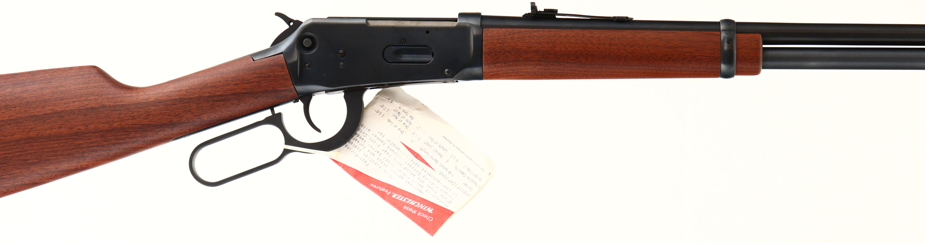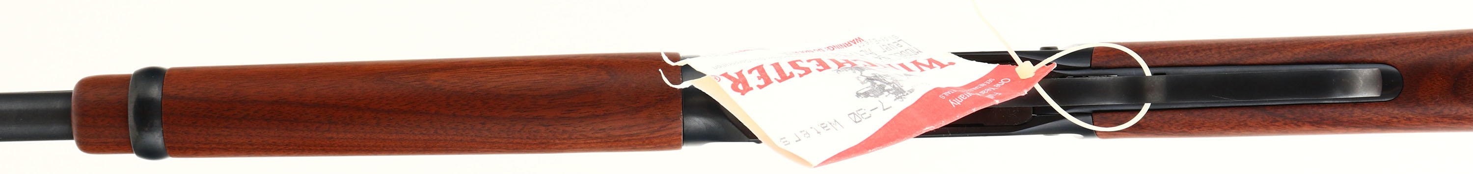 BOXED, Winchester, Model 94 AE Carbine, CAL: 7-30 WATERS, MFG: 1980's/Modern, SN: 6000721, Lever Action Rifle, 20'' barrel, Full mag. The original straight grip wood stocks are near mint, & still carry the factory ''Walnut'' decal on the belly of the stock. The metal blue finish rates 99%+ overall. Bore is mint. Doesn't appear to be fired outside the factory test fire. The barrel holds an adjustable rear sight & hooded blade front sight. Stock carries a Winchester checkered plastic buttplate. Comes in non-matching SN, but correct model factory box, with hammer extension & paperwork. Gun still has stickers & original hang tag. A NIB modern 94 in a rare & seldom seen caliber. FFL Req. - Value: 600 to 1200