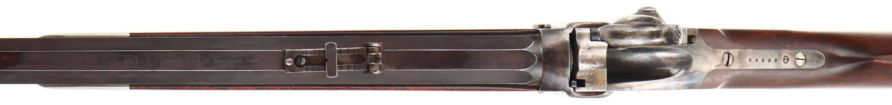 CUSTOM CONVERSION Sharps Sporting Rifle, CAL; 45-120, MFG: N/A, SN: 90699, Lever Action Falling Block Single Shot Rifle, 29 3/4'' octagon barrel. This rifle started life as 1863 Military Purcussion carbine. These military carbines were later converted for a 50-70 centerfire matalic cartridge between Feb. 1868 & Oct., 1869 by Sharps Rifle Manufacturing Co. for the government according to the contract Nov. 2, 1867. A new breech block replaced the percussion type for use with these metalic catridges. In the late 1870's these converted rifles were sold off by the military & many of them were again reconfigured for the civilian market by Sharps & other well known specialty shops. This example has been reconfigured to resembled the popular & rare Sharps 1869 Sporting Rifle. The custom straight grip wood stocks are excellent. They display highly figured & beautiful grain & a rich hand rubbed oil finish. The forend has a pewter/silver inlaid Sharps rifle style tip. The finish is overall excellent, displaying minor dings & scrapes. The barrel has an antique flat rust chocolate brown finish. The case-hardened receiver has worn mostly gun metal gray, with shadowy remains of case-colors & actual colors remaining in protected areas. The barrel is stamped ''Old Reliable'', address stamped ''SHARPS RIFLE CO. BRIDGEPORT, CONN.'' & ''CALIBRE 45''. Consignor indicates the barrel is confiugured for a 45-120 cartridge, with an excellent, bright bore, with sharp rilfing. The receiver shows the correct Sharps & Lawrence stamps on the lockplate & right receiver, & the Sharps 1848 patent stamp on the left is still partially visible. The left side of the receiver carries a slotted filler screw where the saddle ring bar once resided. The SN is stamped on the upper tang & on the underside of the barrel under the forend. The barrel holds a ''R. S. Lawrence'' style flip-up ladder rear sight, with graduations from 1 to 8 & a Sharps windage globe sight, with bubble spirit level. The glass cylider in the sight is of the early plum color, but does not have any liquid remaining. The stock carries a smooth crescent metal buttplate. Double set triggers. The mechanics all appear very good. Rifle comes in a custom green case, with brown leather accents, straps & burgundy interior. Includes in the case is a tall sliding aperature disc tang sight, with screws. This is an excellent looking Sharps Conversion Sporting Rifle. Antique, No FFL Req. - Value: 3000 to 6000