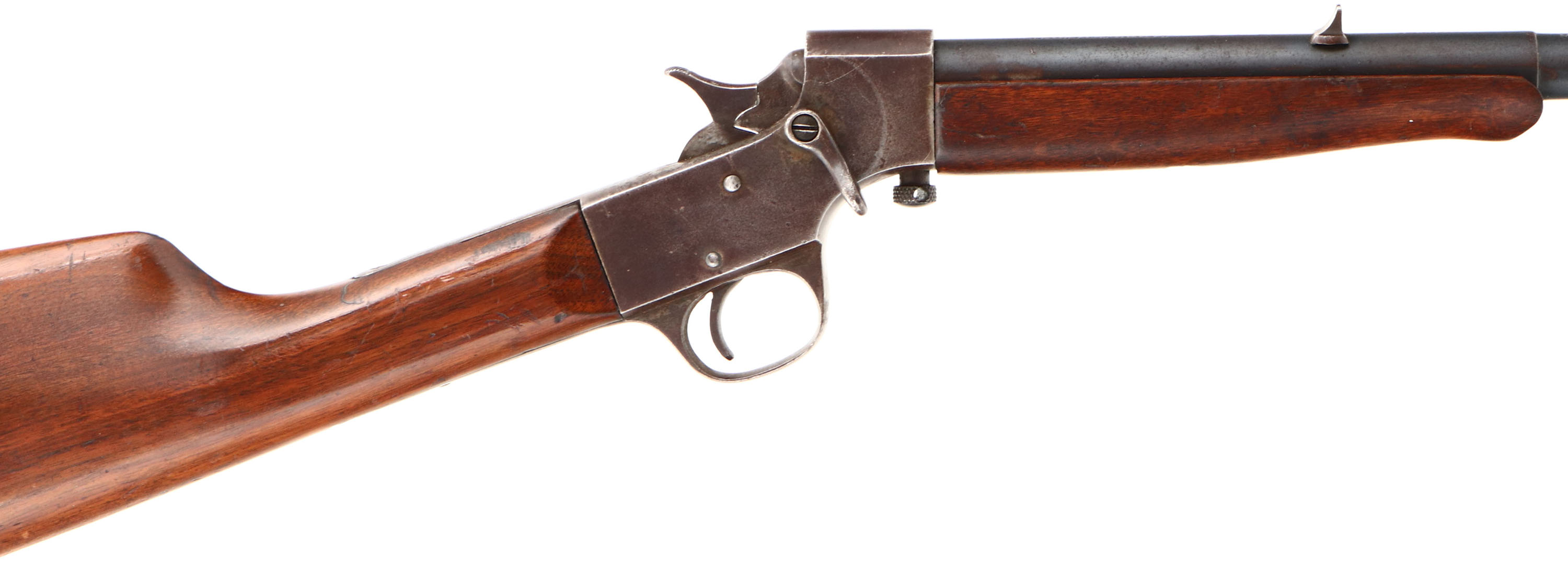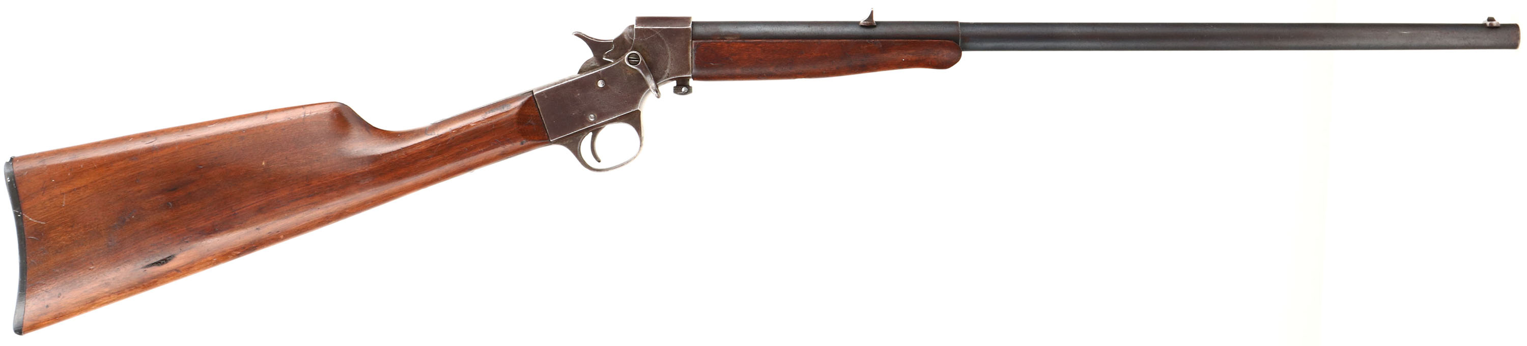 Stevens, Model ''Crack-Shot'', CAL: 32 SHORT RF, MFG: 1913-39, SN: V479, Single Shot Breech Loading Rifle, 20'' Two step barrel. The original straight grip wood stocks very good, with an added layer of finish & displaying contusions & scrapes. The metal blue finish on the barrel rates 80%, with areas of wear toning to a brown patina & some speckling. The receiver has worn gun metal gray with a thin layer of remaining brown patina . Bore is fair, with consistent roughness or light pitting & a ring about 8'' from muzzle. The barrel holds a fixed V-notch rear sight & blade front sight. Buttstock carries a checkered black plastic buttplate. FFL or C&R Req. - Value: 200 to 400