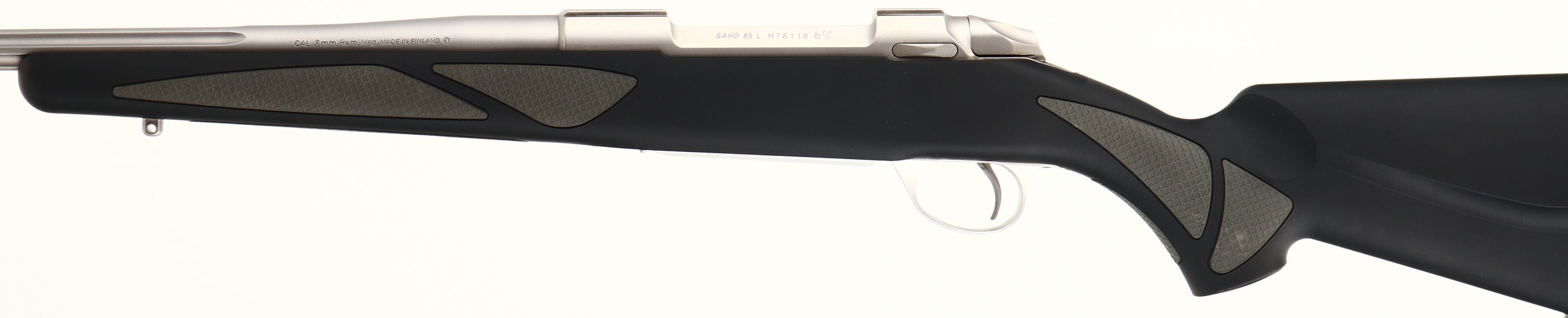 Sako, Model 85 L, CAL: 7mm Rem Mag. MFG: Modern, SN: M76118, Bolt Action Rifle, 24 3/8'' fluted barrel. The synthetic black stock, with textured grip pads is excellent, with few handling marks. The stainless steel finish on the barrel, receiver, floor plate & trigger guard is excellent. Bore is excellent, with strong rifling. No open sight provisions. Receiver has integrated scope mount blocks. Buttstock carries a solid black rubber recoil pad. A high condition modern hunting rifle in a powerful caliber. FFL Req. - Value: 700 to 1400