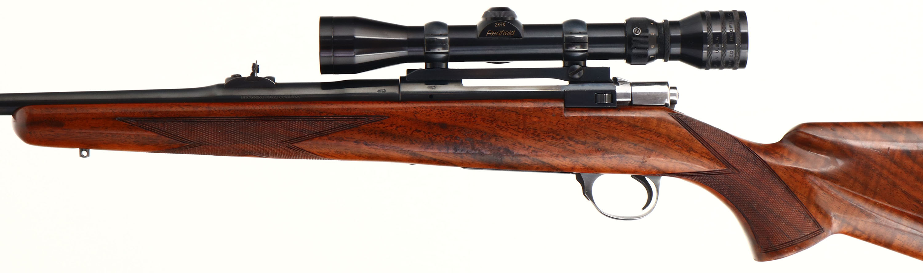 Browning, Model ''High Power'', CAL: 308, MFG: 1961-75, SN: 1812Z4, Bolt Action Rifle, 22'' barrel. This sporting rifle was originally produced by FN & was later made by Sako of Finland from 1961-75, which is where this example was produced. The original checkered & flat pistol grip wood stock is very good. It features hand checkering & a raised cheek. It carries the original high luster finish, but with numerous light surface scrapes, contusions & light scratches. The metal blue finish rates 95% overall. The hinged floor plate & trigger guard have a simple scroll & vine engraving. Bore is excellent & bright, with strong rifling. The barrel holds a standard folding leaf rear sight & ramped blade front sight. The receiver holds a Redfield 2x-7x scope on a Redfield mount. The underside of the bolt handle carries the first four digits of SN. Buttstock carries a Browning black plastic buttplate. Sling studs. Comes with a leather sling. A quality made hunting rifle in a popular big game caliber. FFL Req. - Value: 800 to 1500