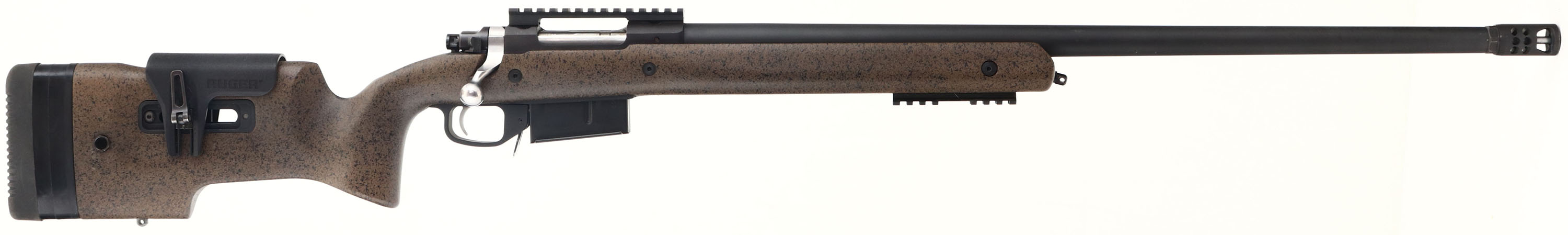 Ruger, Model M77 Hawkeye Long-Range Target, CAL: 6.5 PRC, MFG: Modern, SN: 712-51856, Bolt Action Rifle, 26'' Round barrel (27 5/8'' w/ muzzle brake). The brown & black speckled composite target stock is excellent, with a small green painted square on the stock behind the bolt. It features a two-way adjustable comb, adjustable length of pull with multiple spacers & soft rubber buttpad, QD attachment points & flush-mounted lower M-LOK rail. The matte black finish on the barrel & receiver rates 97% overall, with light scuffs & slight discoloration near the muzzle. There is a Bore is excellent & bright, with sharp rifling. No open sight provisions. Receiver currently holds a 5 3/8'' picatinny rail. The lower M-LOK carries a 3 7/8'' picatinny rail. The heavy contour target barrel features a Ruger Precision: Rifle Hybrid Muzzle Brake. Detachable Ruger Accurate-Mag. Two-Stage adjustable trigger. Sling stud. A lightly used target rifle, ready for the range! FFL Req. - Value: 1000 to 1600