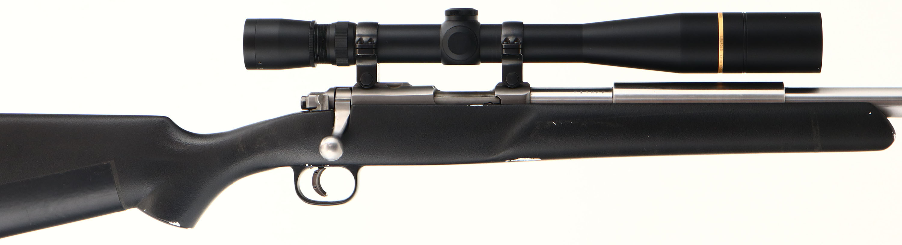 Ruger, All Weather 77/22, CAL: 17HMR, MFG: 2001, SN: 702-50482, Bolt Action Rifle, 22 1/8'' barrel. The custom & flat pistol grip synthetic stock is very good. The stock displays small areas of worn or scraped off texture finish, with an adhesive protective pad running the length of the belly of the stock. Originally calibered in .22, the new custom ''HAPHEY'' .17HMR stainless steel heavy target barrel is excellent. The satin silver receiver is also excellent. Bore is excellent. The receiver carries a Leupold VX-III 6.5-20x40mm Long Range scope, with no open sight provisions on the barrel. Adjustable trigger, currently set to under 1lb trigger pull weight. Stock carries a solid black rubber recoil pad. A very good customized long range target rifle built on the Ruger platform. FFL Req. - Value: 600 to 1200