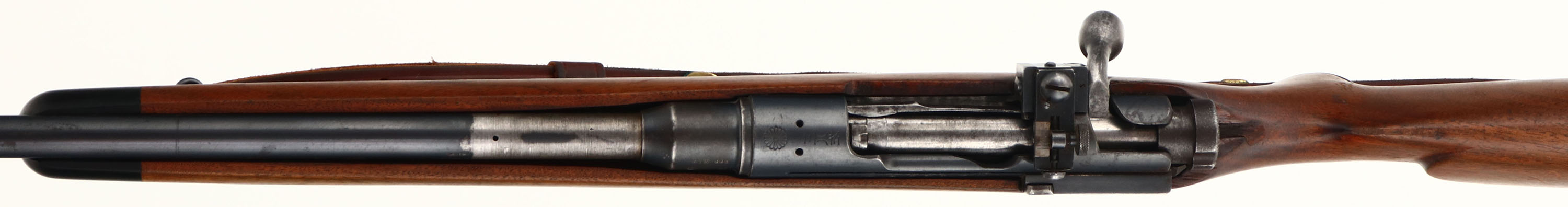 Japanese, Tokyo Arsenal, Sporterized Type 38, CAL: 308 WIN, MFG: 1906-32, SN: 31716, Bolt Action Rifle, 24'' step-down barrel. Top of receiver carries the Chrysanthemum flower seal. Left side of barrel stamped ''WIN 308''. The cheeked & capped pistol grip wood stock, with black forend tip is very good, displaying contusions, scratches, scrapes & dings. There's a small glued edge chip repair behind the bolt & the right side of stock has a 1/2'' natural knot. The metal finish has toned to a mix of metal gray, brown patina & remaining blue. Bore is good, clean & bright, but with spots of roughness between strong rifling. The receiver holds a Lyman 575ME side mounted peep sight, while the barrel has a ramped blade front sight. Buttstock carries a ventilated recoil pad with a small missing chunk at the toe. Sling swivels, with a Hunter 2001 leather sling. FFL or C&R Req. - Value: 200 to 400