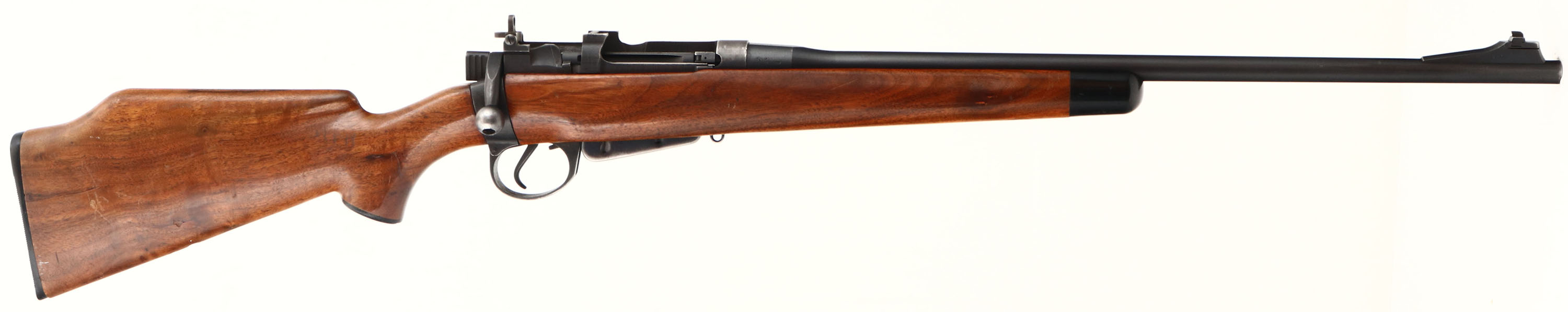 British, No 4 Mk 1 SMLE, Sporterized, CAL: 303 British, MFG: 1944, SN: M39I87, Bolt Action Rifle, 22'' barrel. The cheeked & capped pistol grip Monte Carlo style wood stock is good & solid. Finish is good, with multiple scratches, scrapes & dings. There is a small diamond of checkering near the black forend tip. The metal blue/gray finish on the barrel rates 85%, 70% on the receiver. Bore is good, with strong rifling. The receiver holds a dual flip-up peep rear sight, while the barrel holds a ramped blade front sight. Buttstock carries a grooved black plastic buttplate. The belly of the stock has two open holes & one filed hole from vacated sling studs. FFL or C&R Req. - Value: 250 to 500