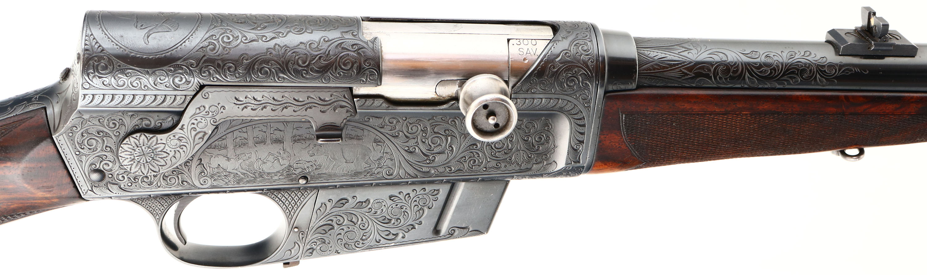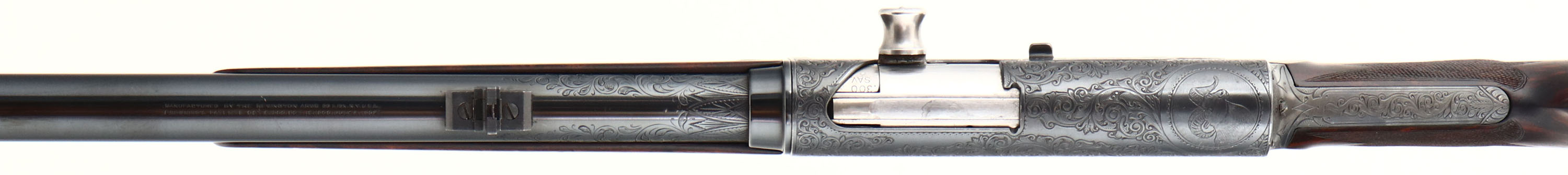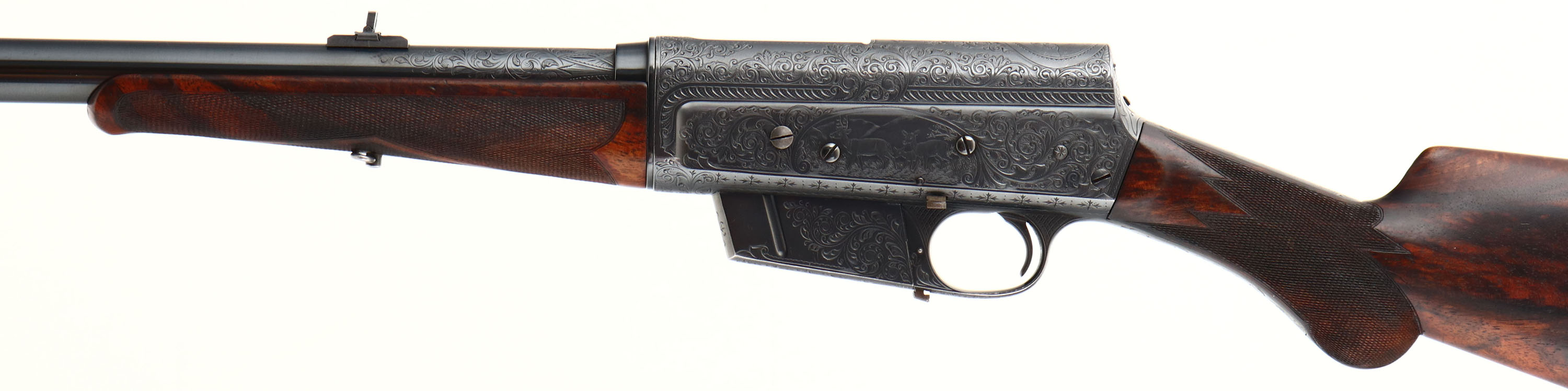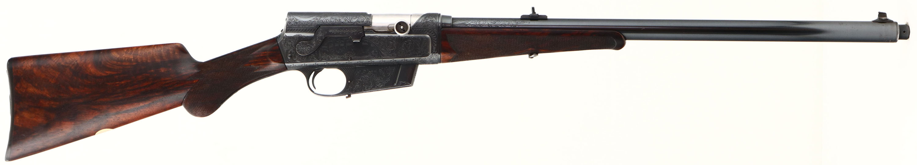 MAGNIFICENT Remington Custom Shop Rifle, Model 8 ''F'' Grade, Marked .300 SAV. Cal., MFG: 1909, SN: 16665, Semi-Auto Rifle, 22'' barrel, This rifle, invented by John Browning, was America's first successful semi auto high-power rifle. It has a 4 shot detachable magazine. These take-down rifles were often broken down into the 22'' & 20'' halves & placed into leather cases for train rides to countryside hunts & shoots. This No. 6 ''Premier or F'' grade rifle was the highest grade rifle Remington offered in their catalog. Factory specifications for the Premier grade read, ''stock & fore-arm of the finest Circassian walnut inlaid with gold name plate & finished with delicate but elaborate checkering. The engraving on this rifle is equal to that on the Premier grade Auto shotgun & is all that could be desired by the most exacting sportsman. All working parts were hand polished in the custom shop. The large receiver side panels are covered with what Remington marketed as ''nearly 100% coverage of deep rich scroll hand engraving, with engraved vignettes on both sides of receiver & a large game head engraved on the top of the receiver.'' In this case, the left side of the receiver has a standing buck deer & two does, while the right side of the receiver displays a black bear tangling with two hunting dogs. The receiver top is engraved with a shoulder mount of a desert ram. Engraving also found on base of magazine, safety, trigger guard, tangs & barrel jacket. The special-order rifle has beautifully contrasting figured grain, while the finely detailed factory checkering is 24 lines-per-inch. This rifle was cherished by its owner & likely was hunted with, especially since the rifle has two very unusual & rare modifications tor a model 8 rifle. The first being that the rifle magazine & receiver was modified to a detachable magazine, with release button located on the trigger guard. This altered the standard fixed mag to allow for easier loading or the opportunity to swap to a possible second or third loaded mag while hunting. The second upgrade to this rifle was a caliber change from its originally produced in 35 Rem caliber. In 1940 Remington added the very popular 300 Savage caliber to its lineup & the owner of this rifle saw the opportunity to upgrade his rifle to this caliber. The rifle would of been returned to the factory where the internal 35 caliber barrel was swapped with a new 300 Savage barrel & associated parts. The outer barrel shroud appears to have had the bluing restored at the same time as the modification as the blue is on the barrel is a bit deeper blue than the original blue it received some 30 plus years prior. While many model 8 rifle were factory modified to the new caliber by their owners, deluxe or factory engraved rifles carrying the 300 Savage caliber are very rare, & one also having the detachable clip modification are virtually non-existent. The factory inlaid gold name plate in stock remains blank. The overall condition of the checkering & wood finish is excellent. The original metal blue finish on the receiver & other metal parts rates 98%. Bore is excellent & bright. Barrel is mounted with a folding leaf rear sight & Marbles #3 front sight. Factory hard rubber buttplate. Any Remington factory engraved firearm is rare, but examples like this highest grade 8 ''F'' are extremely rare. The main reason for this was they were almost cost prohibitive, as according to the 1936 Remington price list, when the Model 8 production ceased, for the cost of one 8 ''F'' grade rifle, one could purchase five 8A's ''standard grades'' rifles & over 600 rounds of factory ammunition. A very unique & extremely rare rifle & an example of the finest early 20th century engraving. FFL or C&R Req. - Value: 10000 to 15000