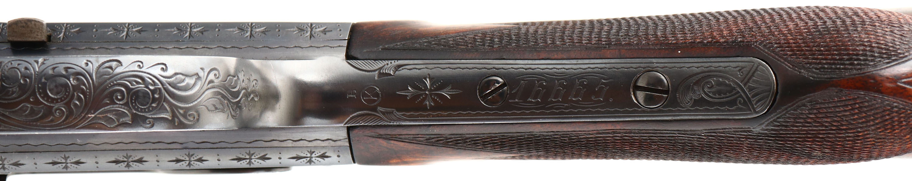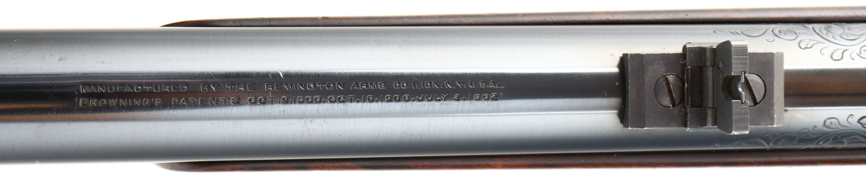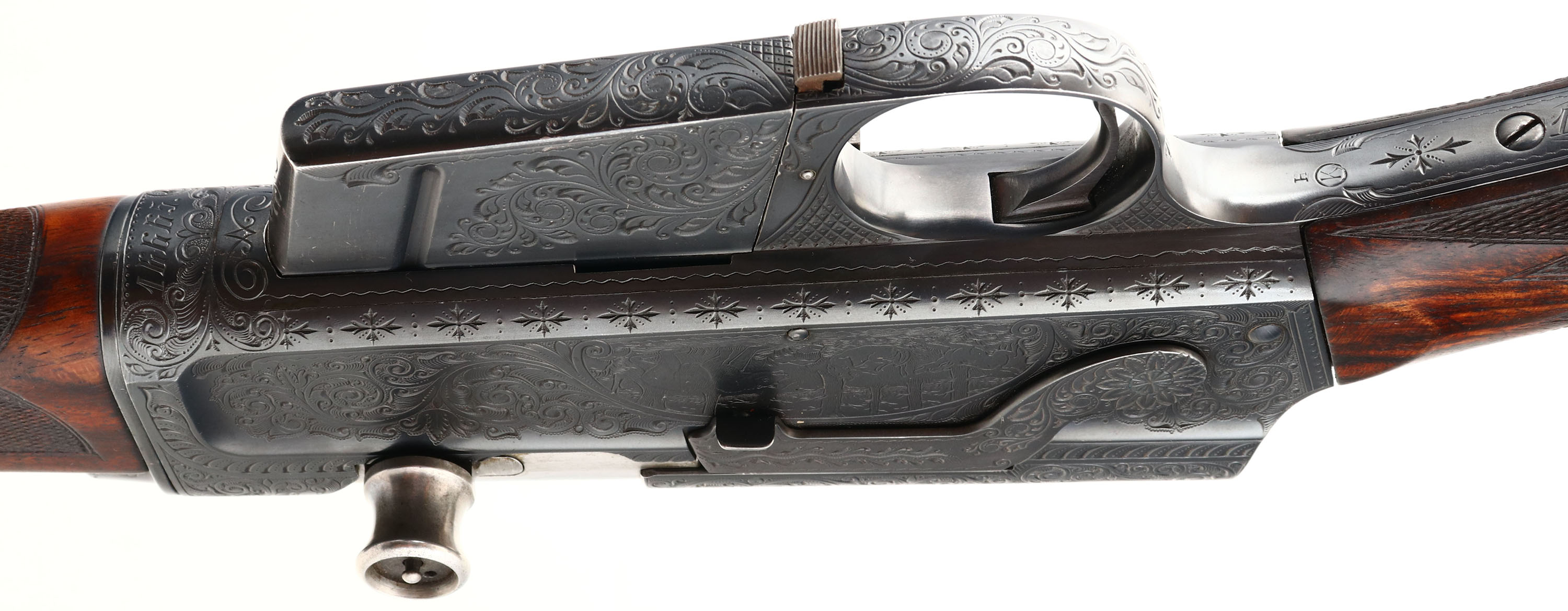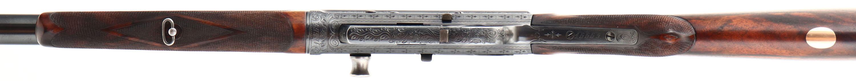 MAGNIFICENT Remington Custom Shop Rifle, Model 8 ''F'' Grade, Marked .300 SAV. Cal., MFG: 1909, SN: 16665, Semi-Auto Rifle, 22'' barrel, This rifle, invented by John Browning, was America's first successful semi auto high-power rifle. It has a 4 shot detachable magazine. These take-down rifles were often broken down into the 22'' & 20'' halves & placed into leather cases for train rides to countryside hunts & shoots. This No. 6 ''Premier or F'' grade rifle was the highest grade rifle Remington offered in their catalog. Factory specifications for the Premier grade read, ''stock & fore-arm of the finest Circassian walnut inlaid with gold name plate & finished with delicate but elaborate checkering. The engraving on this rifle is equal to that on the Premier grade Auto shotgun & is all that could be desired by the most exacting sportsman. All working parts were hand polished in the custom shop. The large receiver side panels are covered with what Remington marketed as ''nearly 100% coverage of deep rich scroll hand engraving, with engraved vignettes on both sides of receiver & a large game head engraved on the top of the receiver.'' In this case, the left side of the receiver has a standing buck deer & two does, while the right side of the receiver displays a black bear tangling with two hunting dogs. The receiver top is engraved with a shoulder mount of a desert ram. Engraving also found on base of magazine, safety, trigger guard, tangs & barrel jacket. The special-order rifle has beautifully contrasting figured grain, while the finely detailed factory checkering is 24 lines-per-inch. This rifle was cherished by its owner & likely was hunted with, especially since the rifle has two very unusual & rare modifications tor a model 8 rifle. The first being that the rifle magazine & receiver was modified to a detachable magazine, with release button located on the trigger guard. This altered the standard fixed mag to allow for easier loading or the opportunity to swap to a possible second or third loaded mag while hunting. The second upgrade to this rifle was a caliber change from its originally produced in 35 Rem caliber. In 1940 Remington added the very popular 300 Savage caliber to its lineup & the owner of this rifle saw the opportunity to upgrade his rifle to this caliber. The rifle would of been returned to the factory where the internal 35 caliber barrel was swapped with a new 300 Savage barrel & associated parts. The outer barrel shroud appears to have had the bluing restored at the same time as the modification as the blue is on the barrel is a bit deeper blue than the original blue it received some 30 plus years prior. While many model 8 rifle were factory modified to the new caliber by their owners, deluxe or factory engraved rifles carrying the 300 Savage caliber are very rare, & one also having the detachable clip modification are virtually non-existent. The factory inlaid gold name plate in stock remains blank. The overall condition of the checkering & wood finish is excellent. The original metal blue finish on the receiver & other metal parts rates 98%. Bore is excellent & bright. Barrel is mounted with a folding leaf rear sight & Marbles #3 front sight. Factory hard rubber buttplate. Any Remington factory engraved firearm is rare, but examples like this highest grade 8 ''F'' are extremely rare. The main reason for this was they were almost cost prohibitive, as according to the 1936 Remington price list, when the Model 8 production ceased, for the cost of one 8 ''F'' grade rifle, one could purchase five 8A's ''standard grades'' rifles & over 600 rounds of factory ammunition. A very unique & extremely rare rifle & an example of the finest early 20th century engraving. FFL or C&R Req. - Value: 10000 to 15000