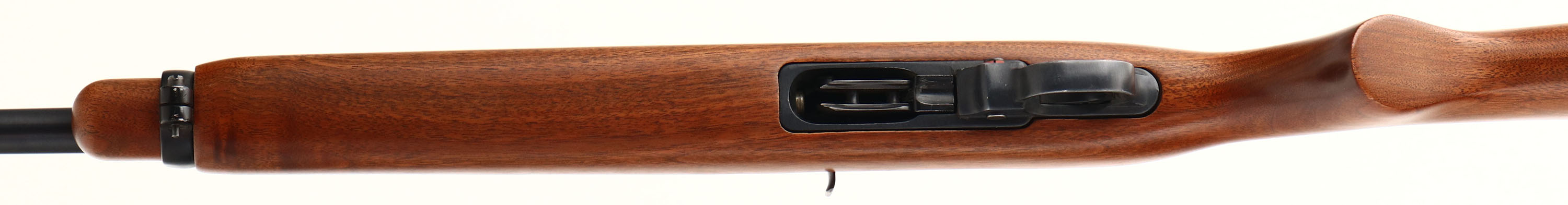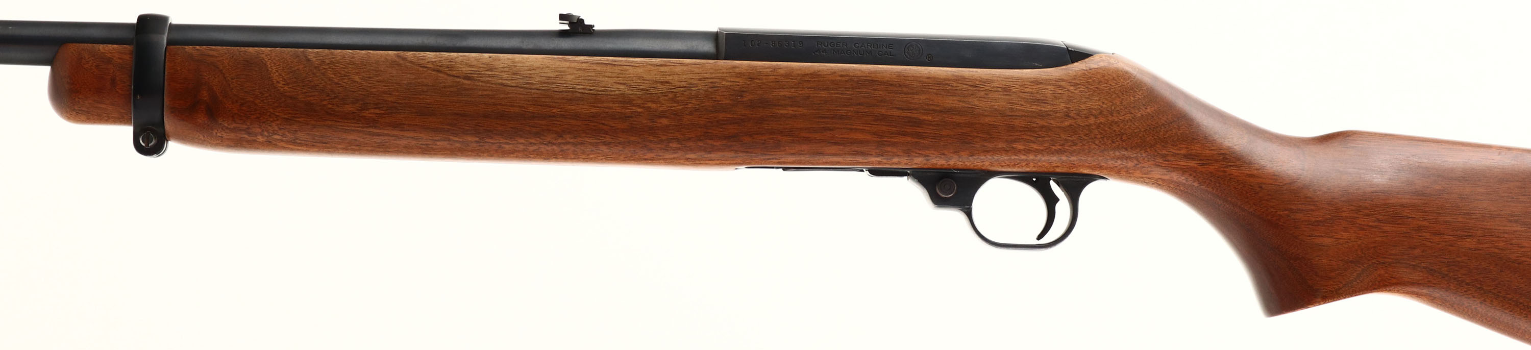 Ruger, Model 44 Carbine, CAL: 44 MAGNUM, MFG: 1980, SN: 102-86319, Semi-Auto Rifle, 18 1/4'' barrel. The original flat pistol grip wood stock is excellent, with the original finish. There are very few tiny handling marks. The metal blue finish on the barrel rates 98%. The receiver has two factory tapped holes on the top which have been professionally filled & the receiver has been nicely refinished. The top of receiver & back end of the barrel both carry four open holes from previous scope mounting. The barrel carries a flip-up rear sight & elevated blade front sight. Bore is excellent. Buttstock carries a smooth plastic carbine style buttplate. A very nice carbine. FFL Req. - Value: 400 to 800