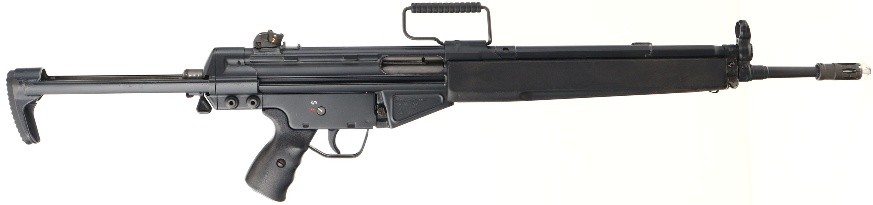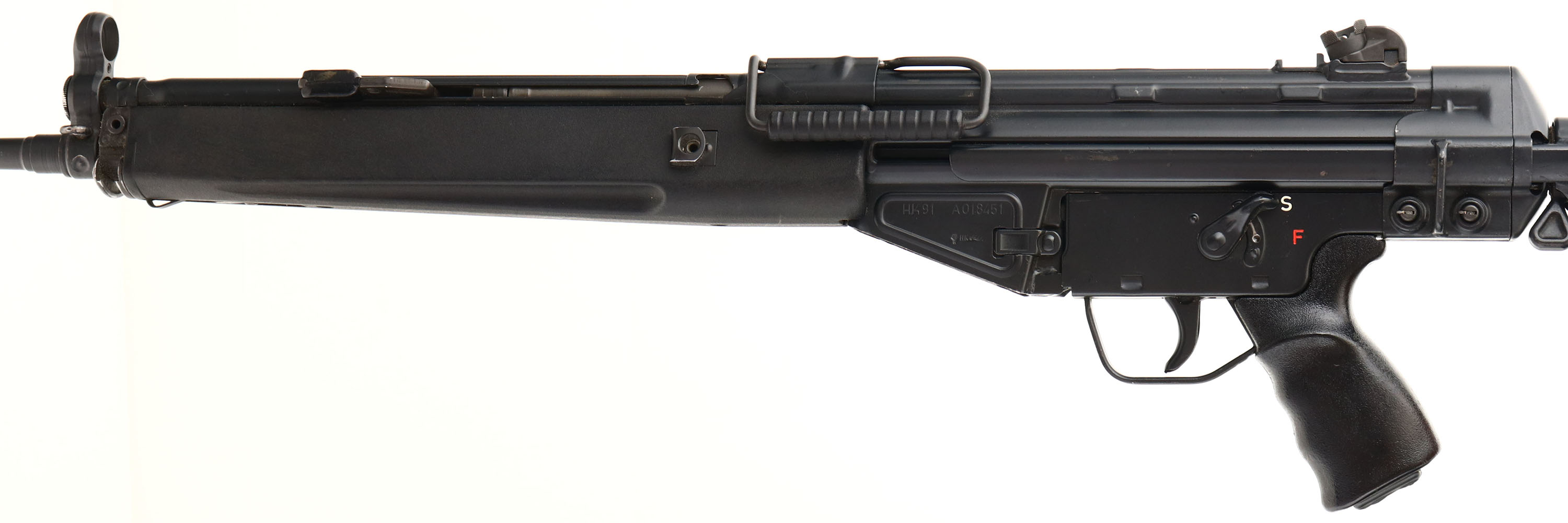 Heckler & Koch, Model HK91, CAL: 7.62x51mm NATO (.308), MFG: 1979, SN: A018451, Semi Auto Rifle, 19'' barrel. The HK91 is a semiautomatic rifle version of the Heckler & Koch G3 automatic rifle that was produced by Heckler & Koch for the civilian market in the 1960's. The retractable one position metal stock, polymer handguard & pistol grip are excellent, displaying overall minor wear from use. The metal finish rates 95% overall, with light scuffs & scrapes. Bore is excellent. The rifle is fitted with a standard turn adjustable rear sight & elevated front globe sight. Buttstock carries a solid textured buttplate. No magazine. FFL Req. - Value: 1250 to 2750
