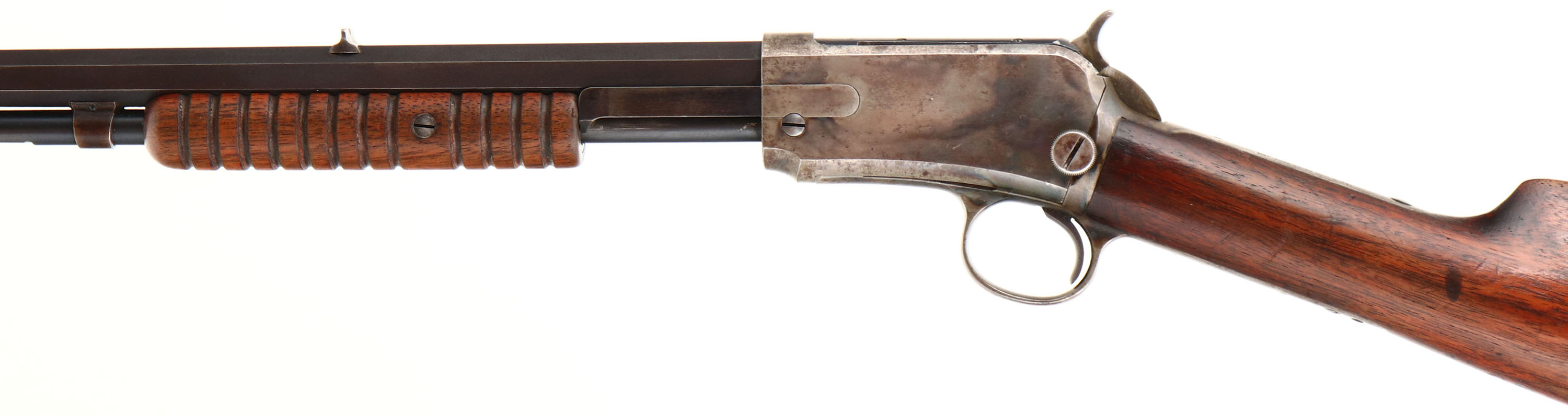 Winchester, Model 1890, 2nd Variation, CAL: 22 LONG, MFG: 1898 SN: 56145, Pump Action Rifle, 24 3/8'' Octagon barrel. The original straight grip wood stock & corncob style forend are excellent & solid. They carry the original finish thinning in areas of carry & display several minor contusions, dings & surface scrapes. The original metal blue finish on the barrel & mag remains at 90% coverage & has toned to a plum/brown patina as it thins. The case-hardened receiver has a mix of fading case colors & muted outlines. Bore is very good. The barrel holds a fixed rear sight & standard front sight. Buttstock carries a smooth crescent metal buttplate. Smooth tight action. Collectible as an original case-colored antique rifle.* Antique, No FFL Req. - Value: 3000 to 5000