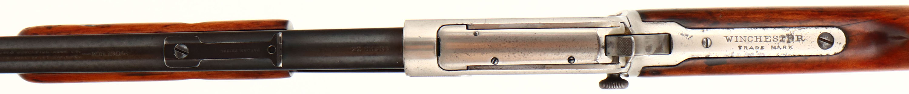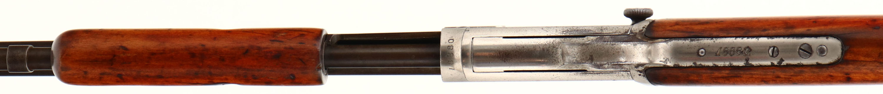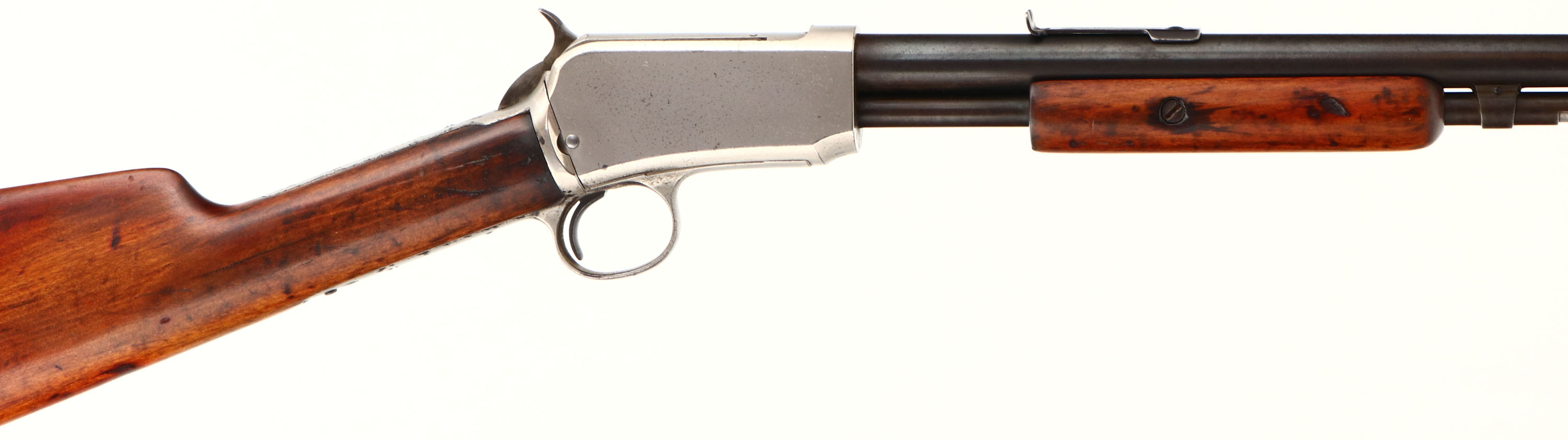 RARE Winchester, Model 1906 1/2 Nickeled GALLERY, .22 SHORT, MFG: 1906, SN: 18880, Pump Action Rifle, 20'' Round barrel, While nearly 700,000 Model 1906 rifles were produced, only a small percentage were nickeled & chambered in .22 Short only. The original gum wood stock are very good, with the original finish displaying numerous minor scratches, rubs & minor contusions. The metal blue finish on the barrel & mag has toned to a gray/brown tone, with approximately 70% coverage. The receiver carries the original special ordered nickeled finish with light speckling & edge flaking. Bore is excellent. Fitted with standard barrel sights. Mag tube has the rare wide cut short caliber feeding slot meant for quick loading in shooting galleries. Winchester plastic buttplate. A rare & collectible nickeled Short only rifle.* FFL or C&R Req. - Value: 2000 to 4000