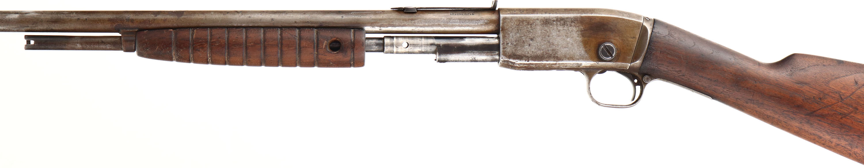 Remington, Model 12-A, CAL: 22 S.L.LR, MFG: 1936, SN: 65602, Pump Action Rifle, 22'' Round barrel. The straight grip wood stock is good, displaying numerous contusions, scratches & scrapes, with worn finish. The forearm is missing the attachment screws & grommets which secure the forearm in place. There is a 1'' crack in the rear portion of the forend. The metal blue finish has entirely toned to a mix of gun metal gray & spotty brown patina, with some light pitting & speckling. Bore is poor, dark & rough. The barrel holds an adjustable rear sight, missing the elevator, & an open front sight dovetail. Buttstock carries a Remington UMC marked crescent metal buttplate. Missing the magazine tube inner. The rifle needs some parts & possible repair & is sold as-is as, with no return. A good project gun & possible restoration. FFL or C&R Req. - Value: 100 to 200