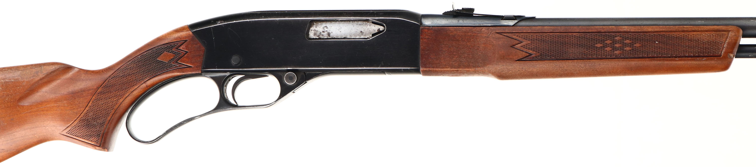 Winchester Model 255, CAL: marked .22 WIN MAG RF (WMR) MFG: 1964-70, SN: B871019, Lever Action Rifle, 20 1/2'' barrel. The original, pressed checkered & flat pistol grip stocks are excellent, with original finish showing some haze, several small handling marks, scuffs, scrapes & contusions. There is a small chip along the edge of the pistol grip. The metal blue finishes rate 80% overall. Bore is excellent. The barrel carries an adjustable rear elevator sight & ramp front sight. Buttstock carries a Winchester marked black plastic buttplate, with whiteline spacer. Jeweled bolt. A very nice original rifle. FFL or C&R Req - Value: 250 to 500