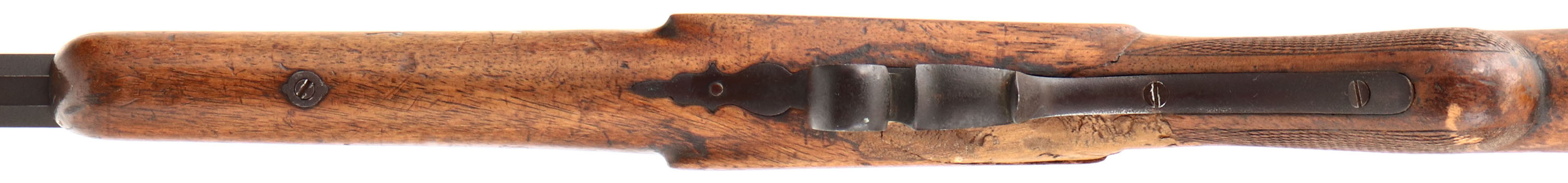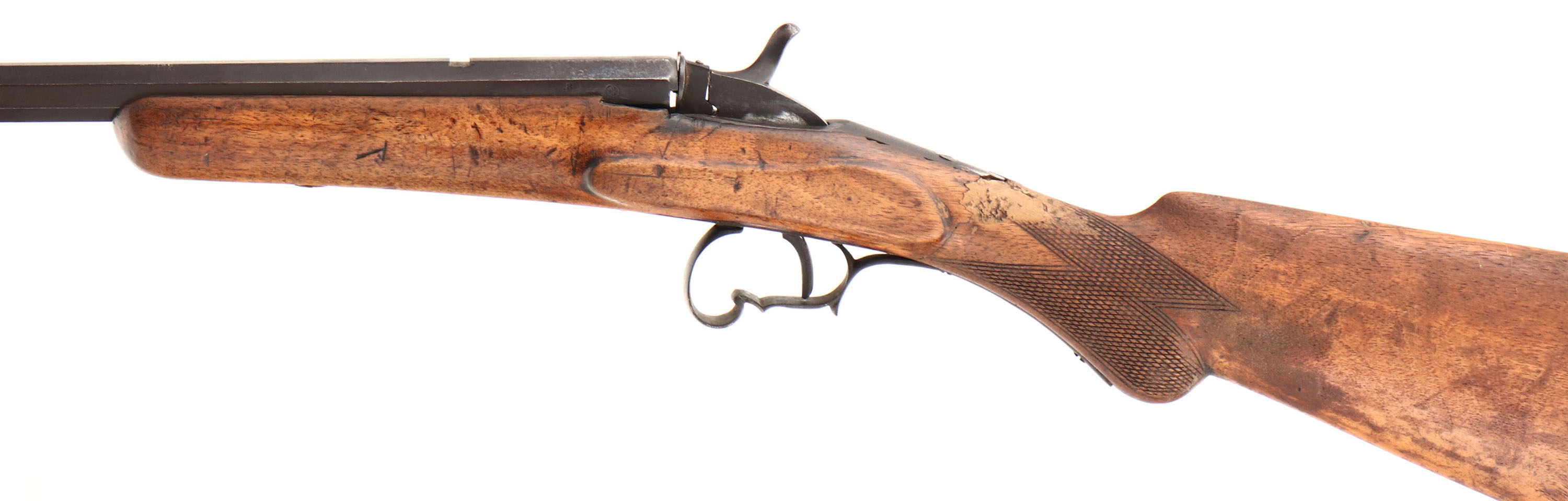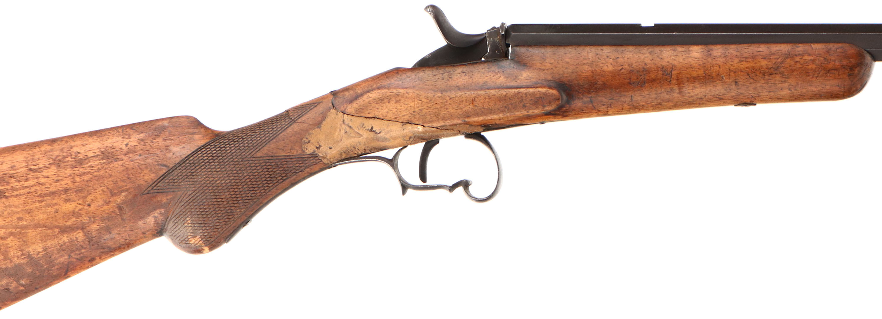 National Arms Co, Flobert Rifle, CAL: 22 Flobert, MFG: Antique, SN: N/A, Belgian Breech Loading Single Shot, 22 1/2'' barrel. The original checkered round knob pistol grip wood stock has multiple breaks, cracks & a fairly crude putty filled repair at the wrist. The stock has worn most of the finish away & has numerous other scratches, scrapes & contusions. The metal has entirely toned to a brown patina. Bore is dark, with roughness amongst worn rifling. The barrel has a open rear dovetail & holds a small blade front sight. Buttstock carries a smooth metal buttplate. Antique, No FFL Req. - Value: 80 to 150