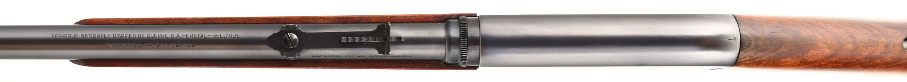 RARE FN Herstal (Browning Patent) Model Semi-Auto .22 Top Loader, CAL: .22 LR, MFG: 1937 (Belgium), SN: 28332T37, Semi Auto Take-down Rifle, 19 1/2'' round barrel. This is generally recognized as the first semi-auto .22 LR produced. Invented by John M. Browning, FN began production in 1914. The rifle was sold around the world, but not in the U.S. because Browning retained the patent rights for the U.S. market & a version of the rifle as a side loader was produced by Remington as the Model 24 & later the 241. Remington ceased production of the 241 at the Ilion, New York plant in 1949. FN first began exporting the Browning SA-22 to the US in 1956, after the expiration of the Remington manufacturing rights. The FN top loader was therefore the predecessor to the Browning SA-22 side loader most of us recognize today. This rifle is therefore one of the early rare predecessors which while not imported into the U.S., somehow made it here. The original round pistol grip Walnut stocks are excellent, with only a couple of tiny storage scuff to the excellent finish. The metal blue finish rates 98% overall. Fitted with the original adjustable rear & small blade front sights. Bore is excellent. The stock carries a metal buttplate. A rare