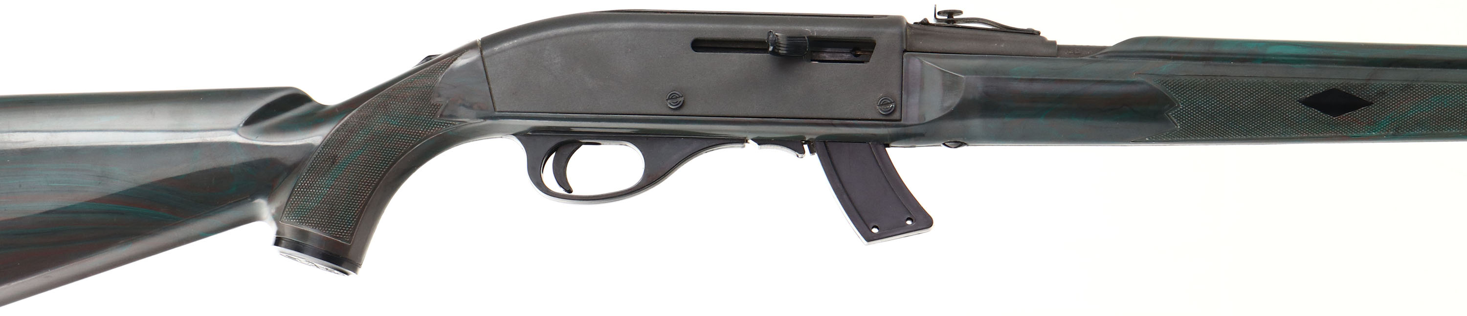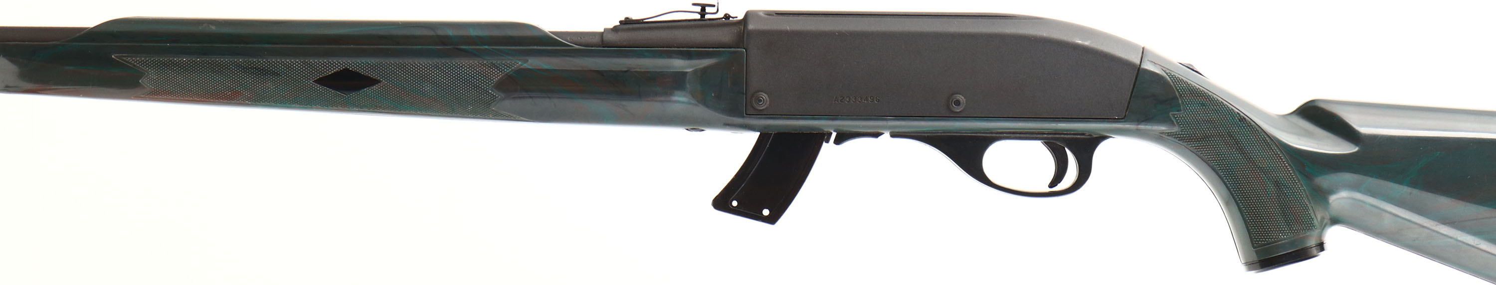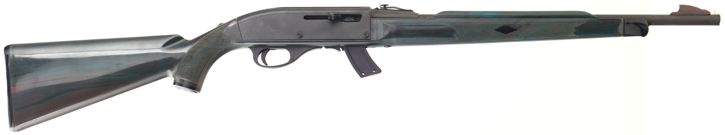 Remington, Nylon Apache 77, .22 Cal. Long Rifle Only, MFG. 1987-89, SN: A2333496, Semi-Auto Rifle, 19 1/2'' round barrel, The Apache K-MART Seneca green (dark olive green), nylon checkered stock is excellent, with very few minor scuffs, Metal is 99%. Factory sights. Bore is excellent. Factory buttplate. Has 10rd clip marked 77. Made only for K-Mart. FFL Req - Value: 500 to 1000