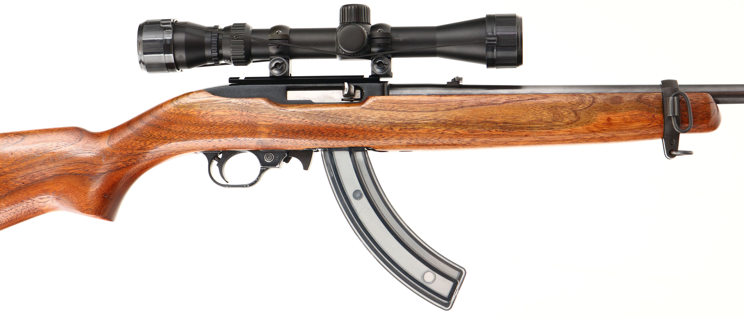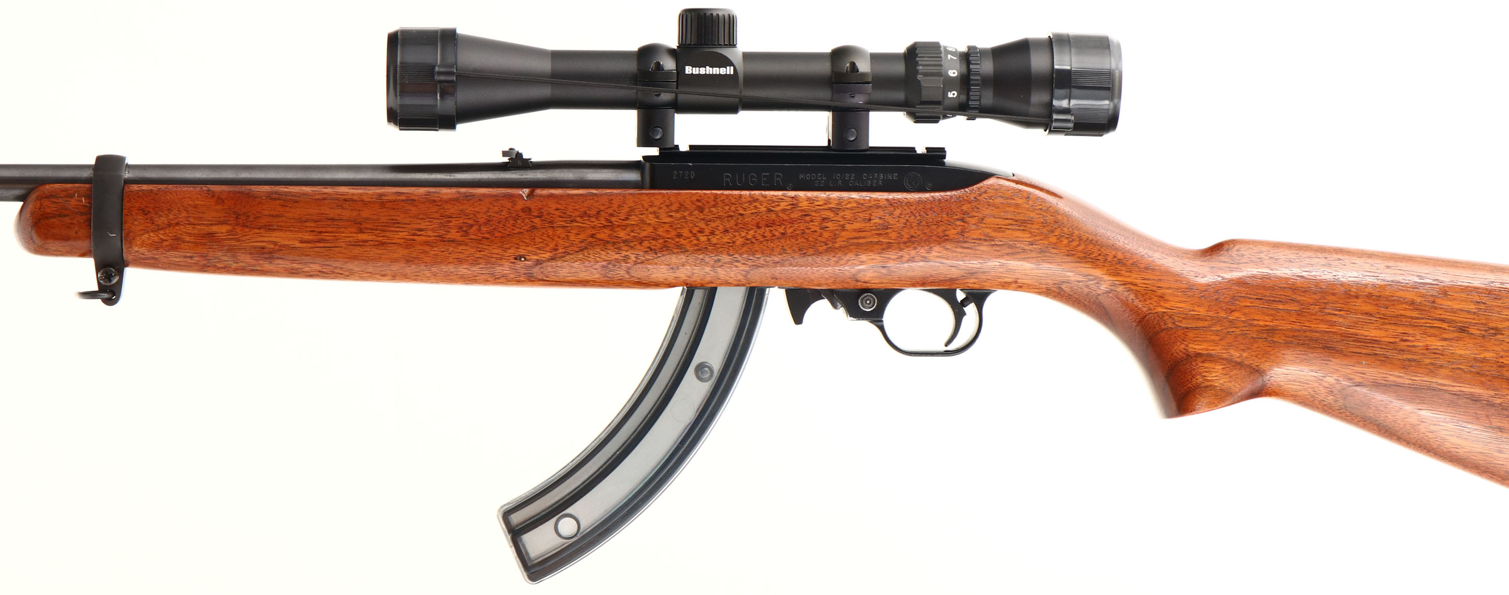 Ruger, Model 10/22 Carbine, CAL: 22LR, MFG: 1966, SN: 2720, Semi-Auto Rifle, 18 1/2'' barrel. The original flat pistol grip wood stock is excellent, with an added layer of finish & minor contusions & handling marks. The metal blue finish on the barrel rates 98%, displaying light scratches & the receiver has a restored black finish, also rating 98%. Bore is excellent, with defined rifling. The rifle is fitted with a Bushnell 3x9 scope, while the barrel has a folding leaf rear sight & elevated blade front sight. Buttstock carries a carbine stylet metal buttplate. Dual sling swivels on front barrel band & on the buttplate. Comes with (2) 25rnd mags. A nicely restored carbine & a great shooter. FFL or C&R Req. - Value: 400 to 600