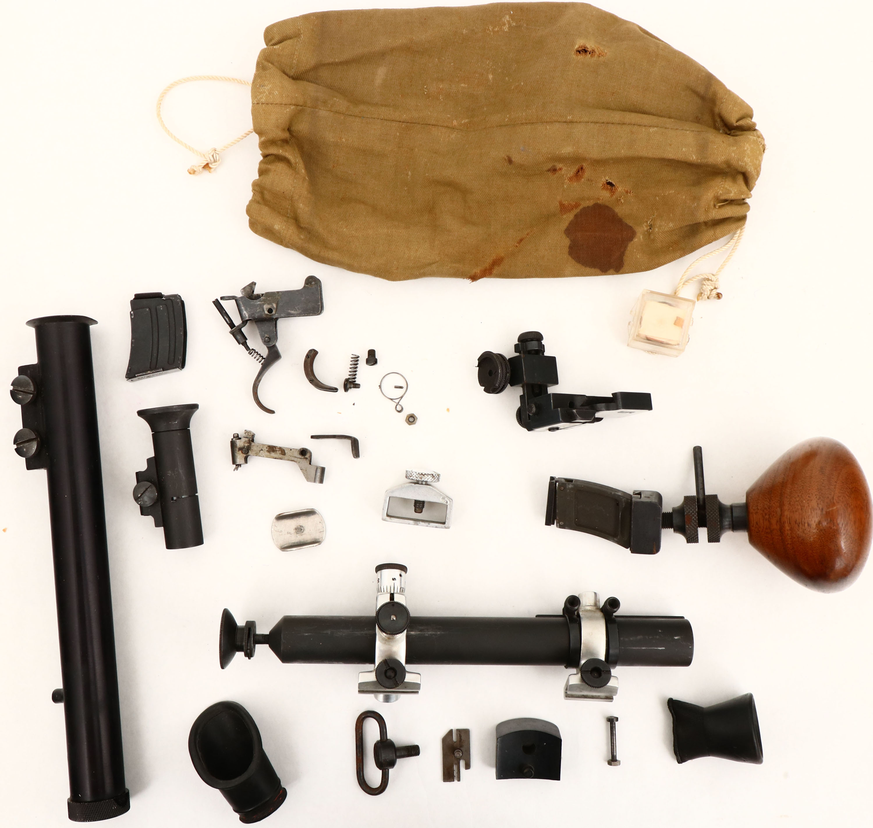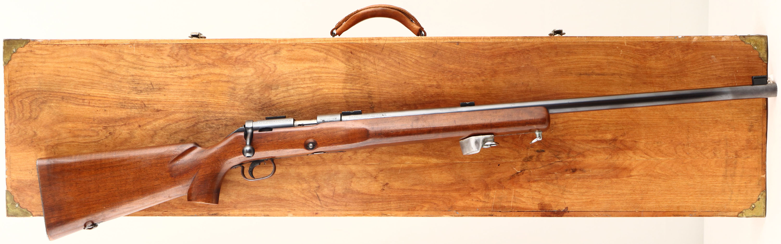 Winchester, Model 52 ''B'' Target rifle, .22 LR. Cal., MFG. 1937, SN: 44428B, Bolt Action Rifle, 28'' Heavy barrel, The original flat pistol grip target stock is excellent & solid. The original factory finish is excellent, with several small scratches or scuffs. Metal blue finish is 98% on barrel, 95% on receiver, while trigger guard is worn to a brown patina. Bore is excellent, The receiver & barrel carry four mounting blocks for scope or sight attachment. Riffle fitted with an upgraded Canjar trigger & the original letter & installation instructions come in the case. The original trigger & parts come in a Ziplock bag. Fitted with a checkered metal buttplate. Comes with original sling swivels & a second set. Rifle carries the original Winchester stamped 5 round mag. Comes with an additional fixed spring single shot Winchester stamped mag & another fixed spring single shot mag mounted on a wooden palm rest. Comes with a Parker Hale receiver sight, with adjustable aperture disk. Also comes with a AL FREELAND sight tube on J. Uberti scope blocks. Also comes with a WOMACK Dual Range sight tube. Also comes with a Redfield Olympic sight tube, with multiple silhouettes. Rifle & accessories come stored in a nicely crafted wooden carrying case with brass corners & a leather handle. FFL or C&R Req. - Value: 1000 to 2000