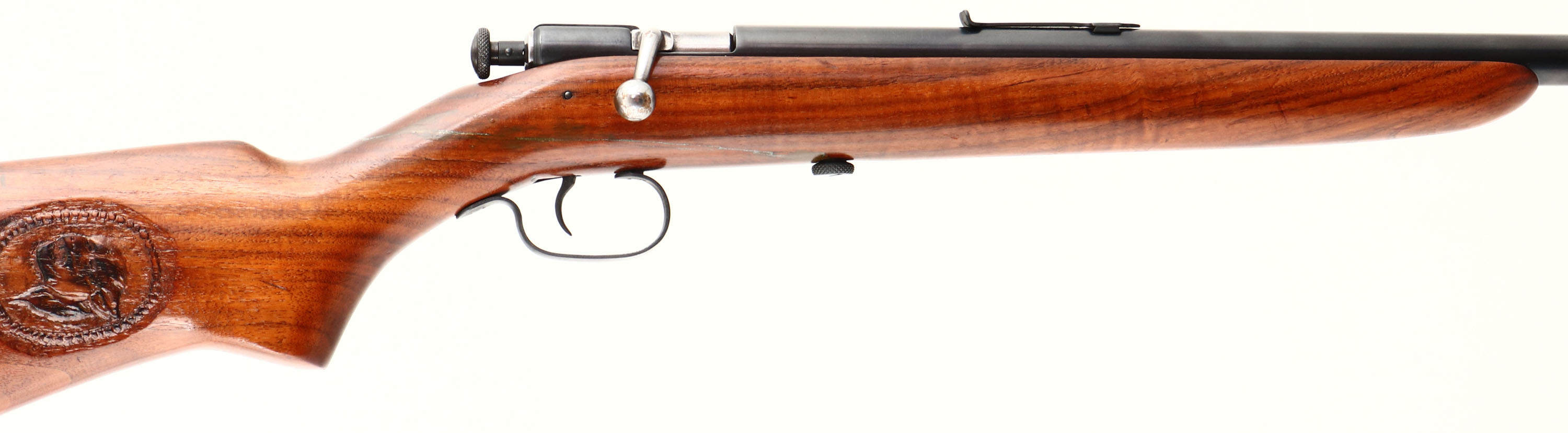 Winchester, Model 60, CAL: 22 S,L,LR, MFG: 1931-34, SN: NONE, Bolt Action Rifle, 23'' barrel. This gun has been nicely refinished. The flat pistol grip wood stock is very good & solid, after a well repaired full break. The stock has been nicely carved on the right side of stock with vignettes of a wooded elk scene & a cougar head. The stock was then refinished, displaying minor handling marks. The metal blue finish rates 95%. Bore is clean & bright, but with barrel bulge 7 1/2'' below the muzzle. The barrel holds an adjustable rear sight (missing elevator) & blade front sight. Stock carries a worn Winchester checkered buttplate. FFL or C&R Req. - Value: 100 to 300