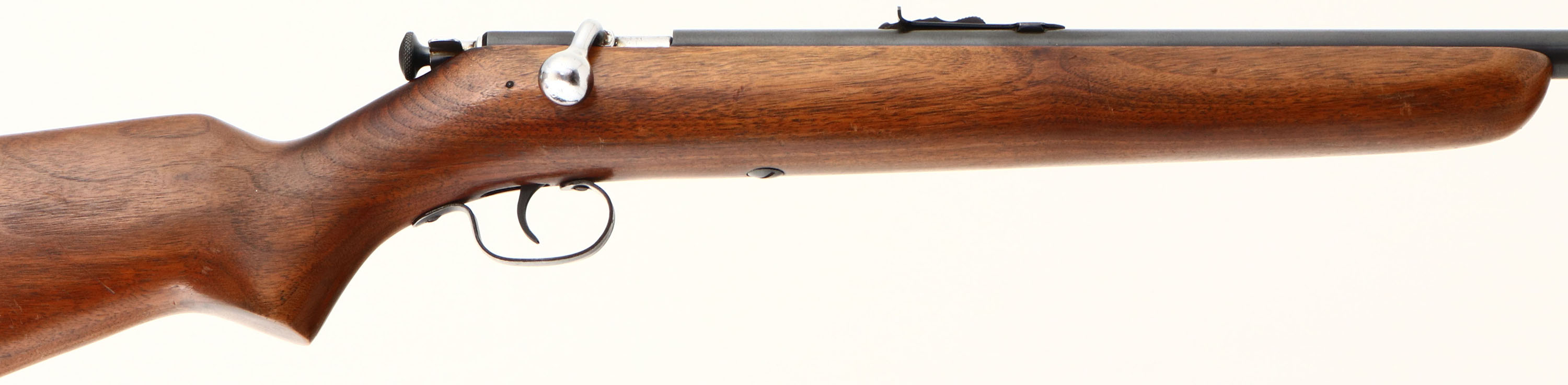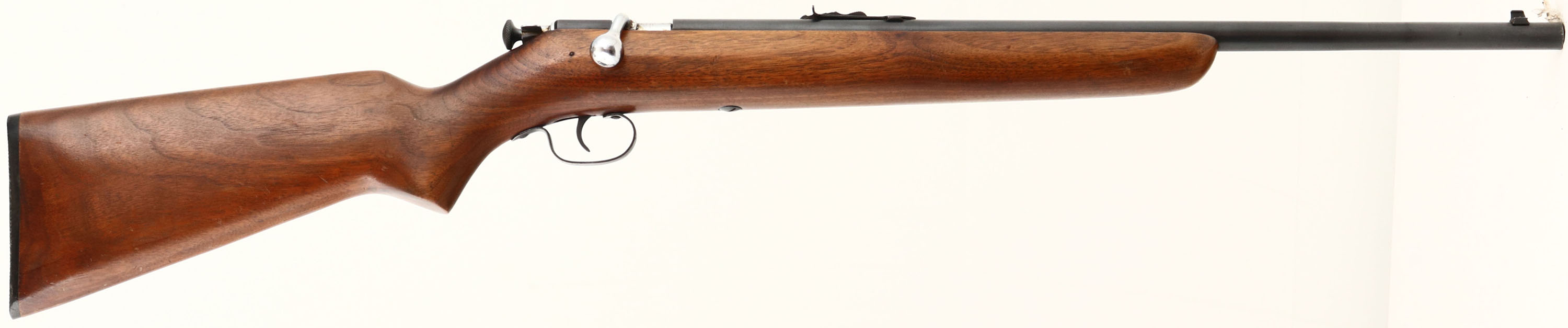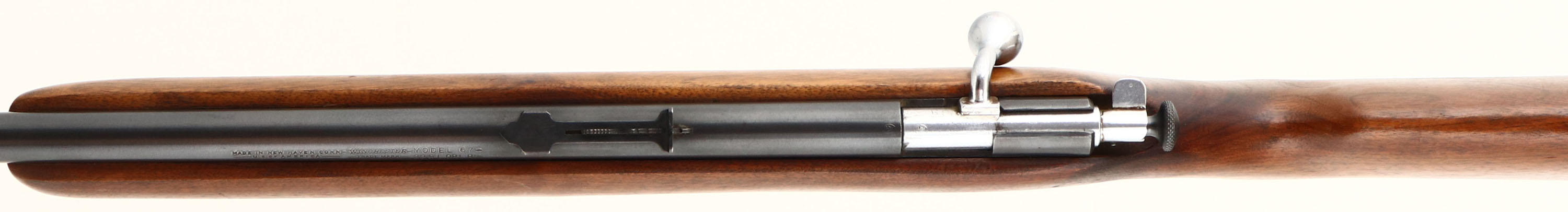 RARE Winchester, Model 67 Boys Rifle or Junior Variation, 22 S, L, or LR Cal., MFG. 1943-63, SN: None, Bolt Action Rifle, 20'' Round barrel. This is the rarer & more desirable ''Boys Rifle'' 4th issue of the model 67 with the shorter factory 20'' barrel. The rifle also has the factory heavier (no groove), flat pistol grip stock, with the slanted forend tip & a blued trigger. The stock is excellent, with the original finish thinning, light sanding & an added layer of protective oils. There are minor contusions & scratches. The metal blue finish has 95% coverage. Bore is excellent, but has a slight bulge 4'' from the muzzle. Mounted with the original sights. Winchester plastic buttplate. A very nice example of a Rare Boys Rifle. FFL or C&R Req. - Value: 200 to 500