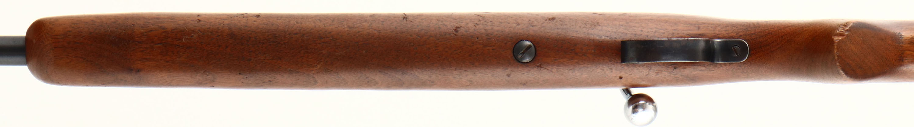 Winchester, Model 67A Target Variation, CAL: 22 S.L.LR, MFG: 1934-63, SN: N/A, Bolt Action Rifle, 27 1/8'' Tapered barrel. The flat pistol grip wood stock is excellent, with the original finish & very few light scratches & contusions. There are a few small chips along the edge of the flat pistol grip. The metal blue finish rates 95% overall. The barrel holds the rarer wheel adjusting Target rear sight & a hooded red bead front blade sight. Bore is excellent & bright. Buttstock carries a Winchester checkered black plastic buttplate. An excellent appearance on this example. FFL or C&R Req. - Value: 400 to 1000