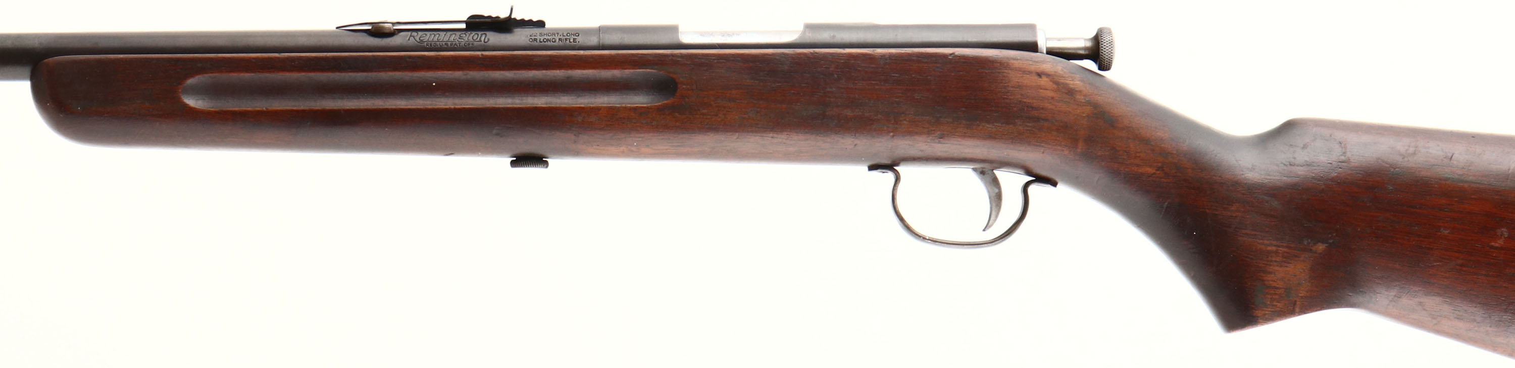 Remington, Model 33, CAL: 22 S,L,LR, MFG: 1931-35, SN: NONE, Bolt Action Rifle, 23'' barrel. The original flat pistol grip stock, with finger grooved forend is very good, displaying scratches, scrapes, contusions to the original finish. The metal finish has toned to a mix of remaining blue, gun metal gray & brown patina, with cleaned pitting throughout. Bore is excellent & bright. The barrel holds an adjustable rear sight & blade front sight. Stock carries a smooth metal buttplate. FFL or C&R Req. - Value: 100 to 300