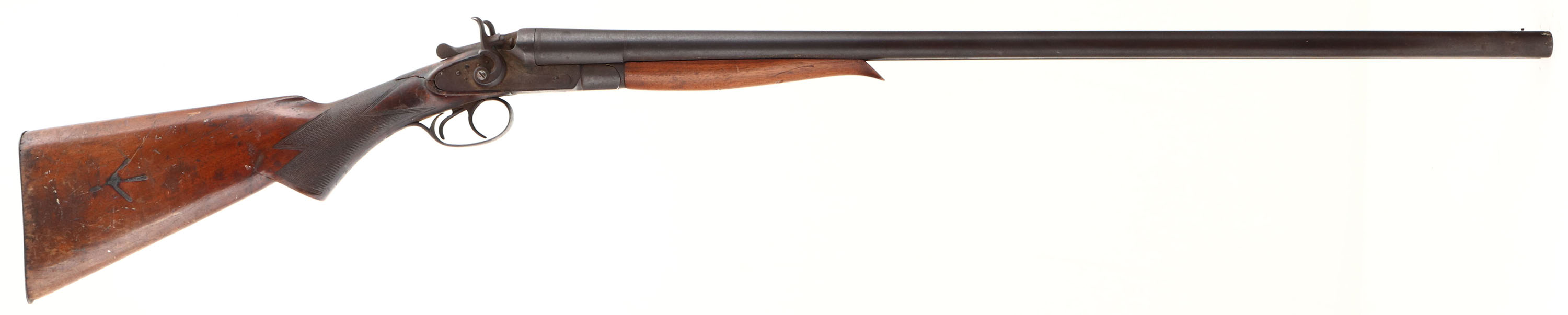 Janssen Sons & Co, Model ''The Interchangeable'', CAL: 12 GA, MFG: Late 1800's, SN: 1371, Break Action SxS Shotgun, 30'' barrels. The flat pistol grip wood stock & forend are fair. The stock has a couple of loose cracks in the area of the wrist & minor edge chips, along with numerous other contusions, scrapes, nicks & dings. Both sides of the stock displays an unknown brand, which appears to be an imprint of bird's foot of some sort. Forearm is likely a replacement. The bottom of the pistol grip has a blank shield initial plate. The metal finish has fully toned to a brown patina, with consistent spotting & pitting. Bores are good, but with age wear & intermittent spotting. The solid rib holds a single front bead. Buttstock carries a grooved metal buttplate. Missing the left nipple firing pin. Double triggers. Antique, No FFL Req. - Value: 100 to 300