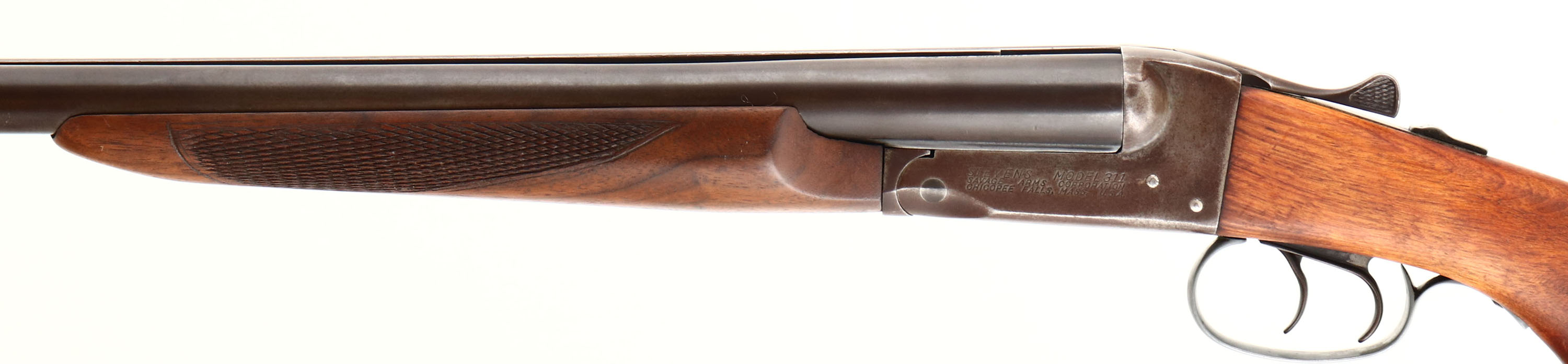 Savage, Stevens Model 311A, CAL: 12 GA, MFG: 1949-65, SN: N/A, Break Action SxS Shotgun, 28'' barrels. The flat pistol grip wood stocks are very good, displaying minor handling marks & light scrapes. The buttstock is sanded smooth, with a flat finish & no checkering on the stock. The checkered forearm appears to carries the original finish The metal finish on the barrels is a mix of metal gray, brown patina & remnants of blue remaining in protected areas. Finish has been removed from the trigger guard. Bores are very good. The solid rib holds a single front bead. Buttstock carries a ventilated recoil pad. Double triggers. FFL or C&R Req. - Value: 200 to 400