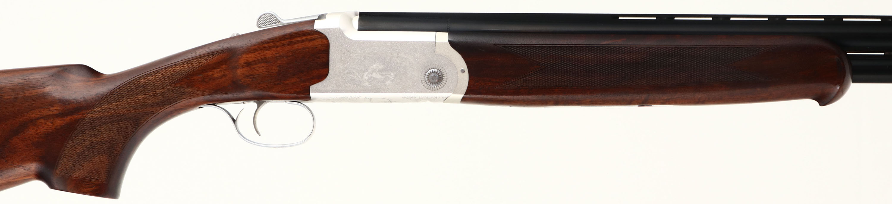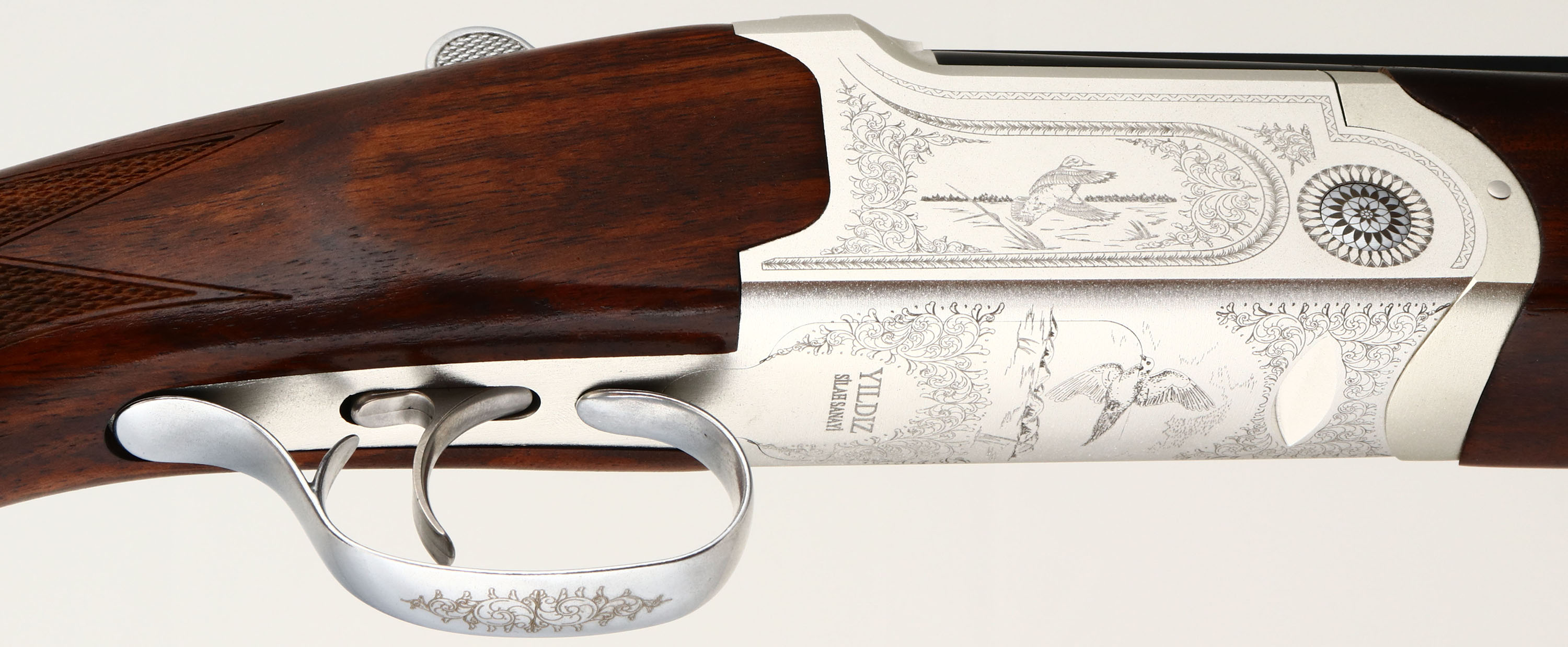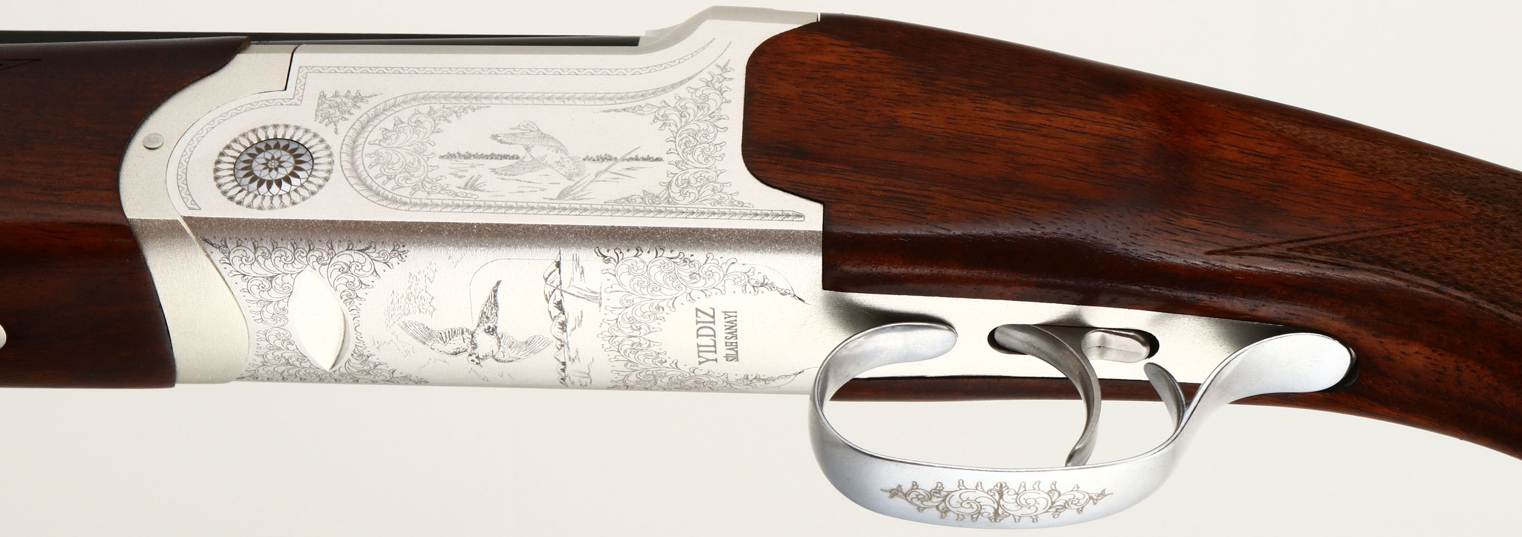NEW, Yildiz, SPZ ME/20, CAL: 20GA, MFG: Modern, SN: U78701, Break Action O/U Shotgun, Choke: 5pc Mobil choke System, 28'' barrel with dual ventilated rib. The deluxe Turkish walnut, checkered flat pistol grip wood stocks are excellent. The 7075 white alloy receiver is excellent & the metal blue finish on the barrels rates 100%. The receiver, trigger guard & break lever display an intricate engraving, a duck on either side of the receiver in a pond setting, a dove on the bottom in a similar setting & ''YILDIZ SILAH SANAYI'' also on the bottom, next to the trigger guard. All engravings are bordered by an attractive ornamental/floral pattern. Bores are excellent. The barrel holds a single front bead. Buttstock carries a solid black rubber recoil pad. Comes in box with original packaging, owners manual, choke tool & extra chokes. This is a NIB gun, never fired. A great addition to any collection! FFL Req. - Value: 1200 to 1800