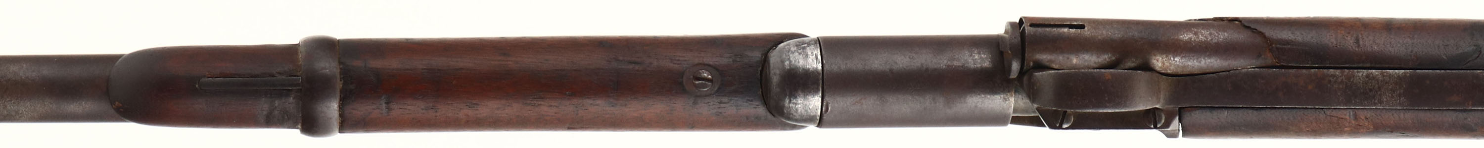 Meriden Manfg Co., Model ''Triplett & Scott Rifle'', CAL: 50 R.F, MFG: 1864-66, SN: 4056, Swivel Breech Loading Rifle, 30'' round barrel. The straight grip American walnut stock & forend are fair. There is a 5 1/4'' glue repaired break/crack left side of the wrist, several small grain cracks on the right wrist & a small 1'' crack on the left side by the buttplate. The stocks still remain solid after repairs & displays small contusions, scrapes, nicks & dings. Marked on left side of receiver in two lines, '' MERIDEN MANGF. CO.'', ''MERIDEN CONN.'' On upper receiver tang: ''TRIPLETT & SCOTT - PATENT DEC 6, 1864''. The right side of the frame is stamped with the full SN. The metal surfaces all carry a rust brown patina, with rust pitting & speckling. The barrel holds a flip-up ladder rear sight, with no graduation marks & a heavy inverted ''V'' blade front sight. Bore is good, with spotty areas of pitting near the muzzle. Buttstock carries a smooth, curved metal buttplate. The unique action appears to function properly. This rifle was issued to Kentucky Home Guard troops who were assigned to protect the supply lines of the Union Army under General Sherman's command. A unique & truly strange two-piece design, with the breech face, firing controls, magazine & buttstock as the rear most assembly, attached to the firing chamber, barrel & forend assembly by a pivoting joint. The gun used a seven round tubular magazine in the buttstock, similar the Spencer, but not removable. The magazine tube is situated off center to the left, along the toe line of the stock. This design left almost no wood in the buttstock over the magazine tube & left the wrist very weak. Every Triplett & Scott has a severe cracks, & often wood loss, as seen in this example as well. To operate the action, the hammer is placed on half cock, & a thumb release catch depressed on the rear of the receiver. This allowed the shooter to rotate the forward half of the receiver to the right (clockwise) & as the forward portion rotated an automatic ejector would extract the spent cartridge case from the receiver, dumping it on the ground. As the forward portion of the receiver was rotated further around, it pushed a spring-loaded door open, which covered the magazine tube. This allows a cartridge to be fed into the firing chamber. Rotating the action back to the left (counter clockwise) closes & locks the action & cocks the hammer fully making the gun ready for firing. While this seems like a complicated system, it did work well & with training, a solider could operate the gun with some efficiency. Antique, No FFL Req. - Value: 800 to 1500