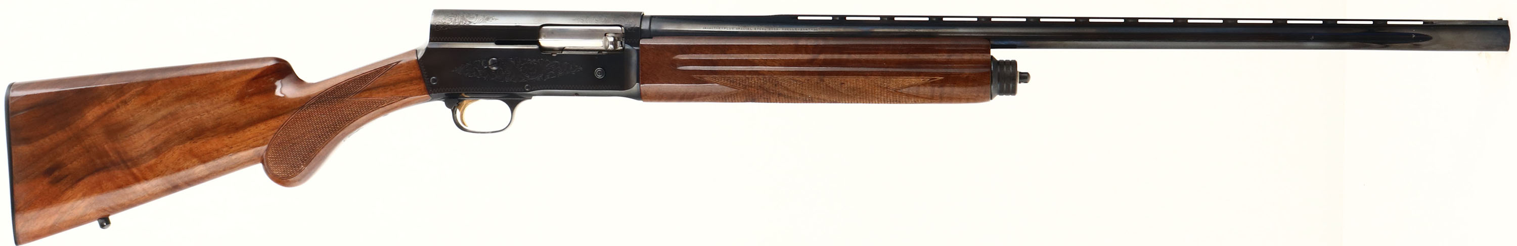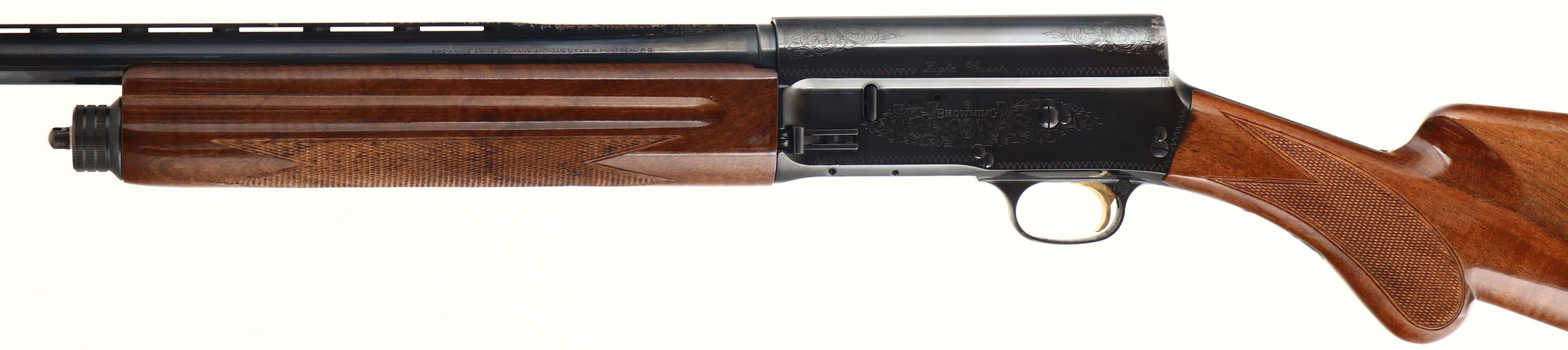 Browning, Model A5 Light Twenty, CAL: 20 GA, MFG: 1996, SN: 13469NT231, Semi Auto Shotgun, Invector Chokes, 25 7/8'' Ventilated barrel. The original checkered & round knob wood stocks are excellent, displaying minor handling marks & scuffs to the original high gloss finish. The metal blue finish rates 90% overall, but with spotty areas of wear, flaking or light pitting. The receiver displays simple scroll, vine & border engravings. Bore is excellent, displaying little to no use. The ventilated rib holds a single front bead, buttstock carries a Browning black plastic buttplate. Gold trigger. Sling studs present. A later produced A5 shotgun in the popular Light Twenty configuration. FFL or C&R Req. - Value: 400 to 1000