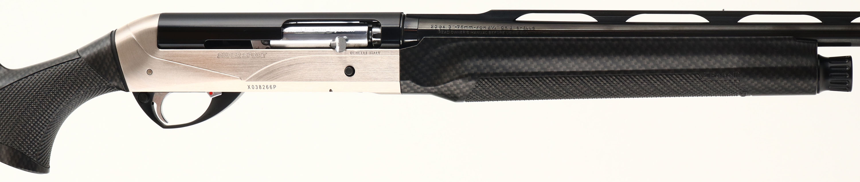 Benelli, Model ETHOS Supersport, CAL: 20 GA, MFG: Modern, SN: X038266P, Semi Auto Shotgun, 27 3/4'' ported Crio barrel. This sleek SuperSport shotgun is a speed gun suited for any clays course or shotgun competition. The textured carbon fiber stocks are excellent. The stock features Benelli's patented ComforTech recoil system, which reduces recoil by nearly 50%. Benelli claims the ComforTech system also mitigates muzzle climb by 15% for fast follow-up shots. The metal blue finish on the barrel rates 99%, the satin nickel receiver is excellent. Bore is excellent, displaying very little use. The ventilated rib holds a small mid-rib steel bead & red fiber optic front sight. Buttstock carries a grooved soft foam recoil pad. Comes with a set of Crio chokes & choke tool. A perfect shotgun for competition shooting! FFL Req. - Value: 1000 to 2000