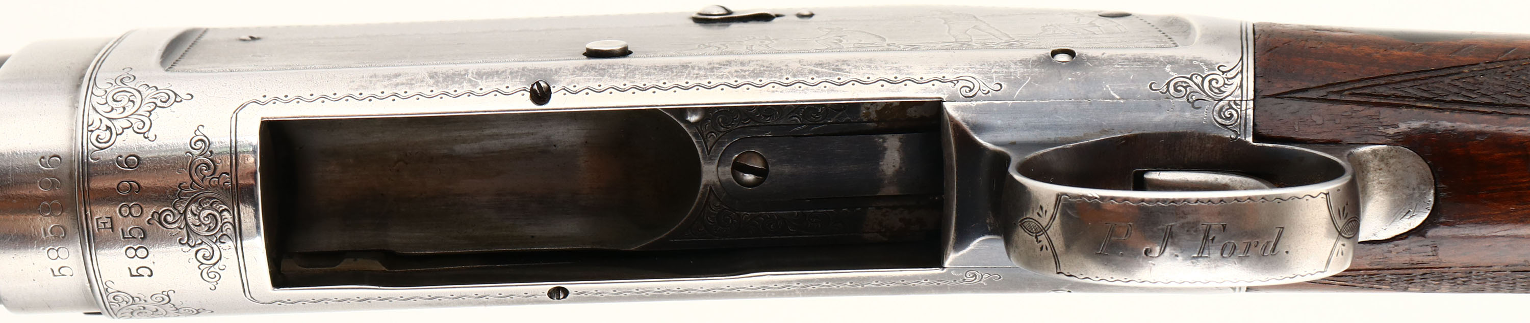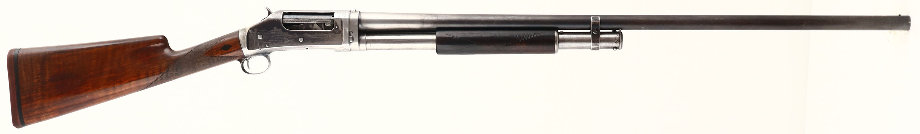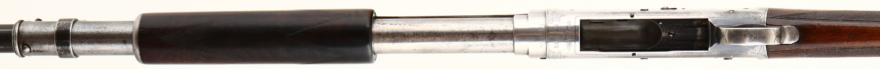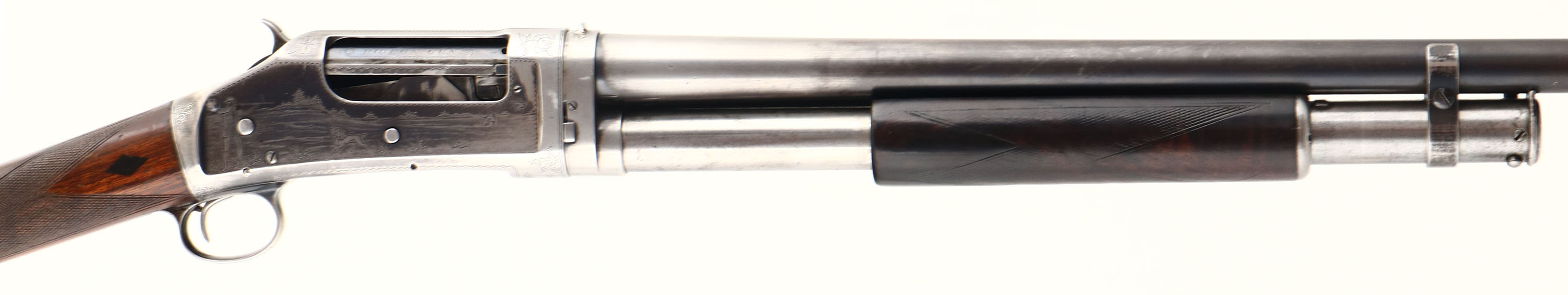 RARE Winchester, Model 1897 Engraved Pigeon Grade, 12 GA., MFG: 1913, SN: 585896, Pump Action Shotgun, 32'' no rib barrel, Full choke, Black Diamond Pigeon Grade, Take down, The original deluxe checkered & straight grip wood stocks are very good & solid. They display the original finish, with an added layer of finish to the stock & a few minor finish level scuffs or dings. The forearm has darkened from use & much of the original checkering has worn smooth. Black diamonds located in the wrist. The original metal blue finish rate 30% overall. Receiver displays panel scene engraving of a live pigeon shoot on the left, grouse hunter & dog on the right, & American scroll & border engraving on the underside& trigger guard. There is an engraved standing pigeon located behind the hammer. Trigger guard is also factory engraved ''P. J. FORD.''. There is a story this shotgun was presented to or at least was owned by an early member of the Ford automobile family, but no records or documents exist to prove that prominence. All engraving, lettering & address are legible. A fixed ''V'' rear sight has been added to the bridge of the receiver, while the barrel carries a single gold bead. The bore is very good. Stock carries a hardened solid red recoil pad. Esthetically, a very nice example of a fairly rare shotgun. FFL or C&R Req. - Value: 3000 to 4500