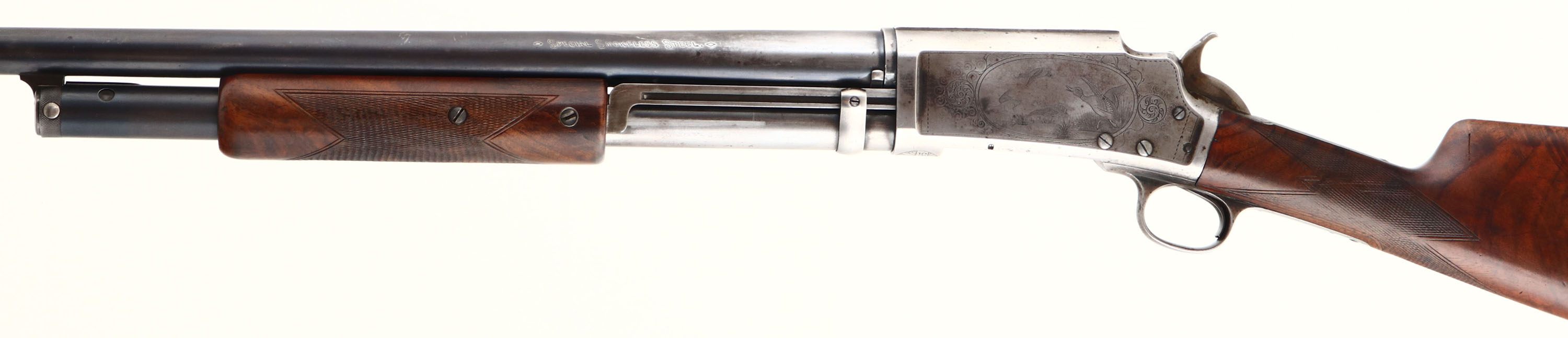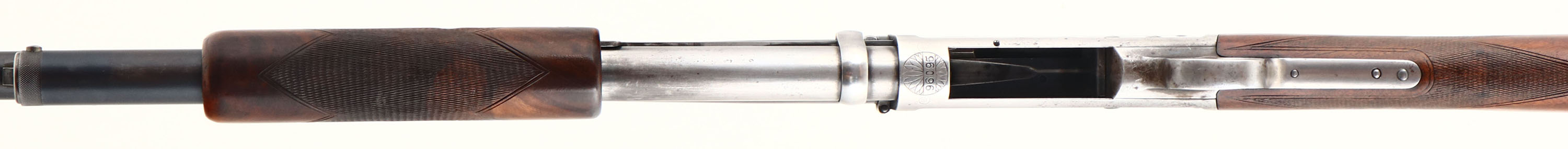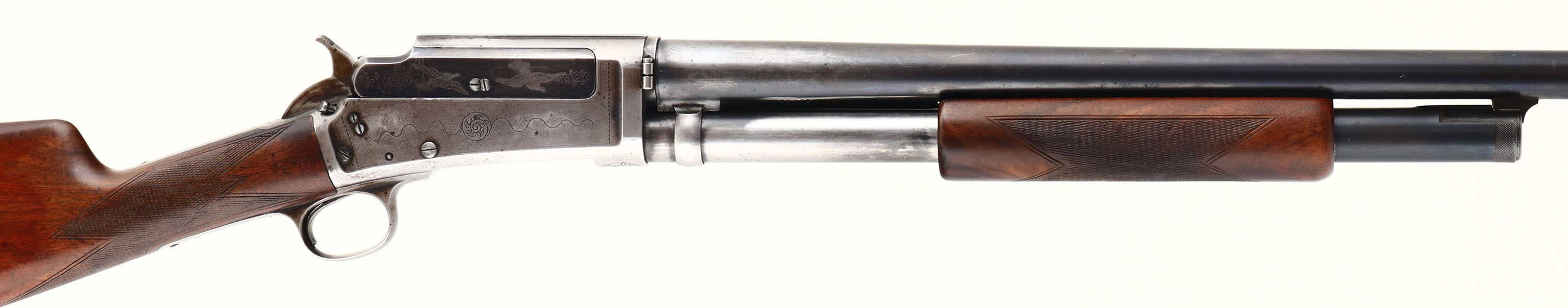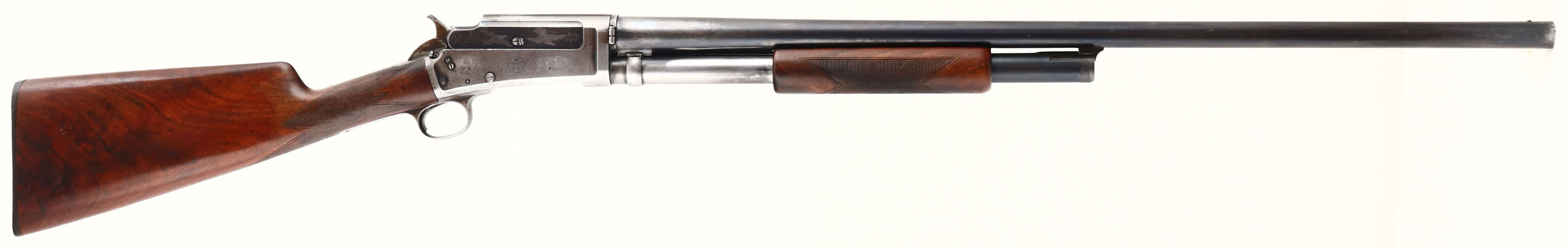 RARE ENGRAVED Marlin, Model No.21 ''C'' Grade, CAL: 12GA, MFG: 1907-08, SN: 96095, Pump Action Shotgun, 30'' barrel. The checkered straight grip wood stock & forend are very good. They were lightly sanded & refinished long ago & now display contusions, scratches, scrapes, & areas of finish thinning or worn dull. The stock does show very nice rippled grain. The metal finish on the barrel & tube has toned to a mix of metal gray & original remaining blue, while the receiver has worn almost fully gun metal gray, with small remnants of blue in protected areas. The receiver is factory engraved, with a group of flying mallards on the left, with bordered by ornamental scroll work, two doves on the slide, with ornamental style engraving on the rest of the right side of receiver. The SN on the bottom of the receiver is bordered by a floral/leaf pattern. Bore is excellent, with minor spotting. The barrel holds a single front bead. Buttstock carries a Marlin grooved plastic buttplate. The Marlin Model 21 was only listed in the catalogs for 2 yrs when it was replaced by the new, Marlin Trap Gun. The Model 21 was Marlin's the first straight grip shotgun, with a takedown system.* FFL or C&R Req. - Value: 1000 to 2000