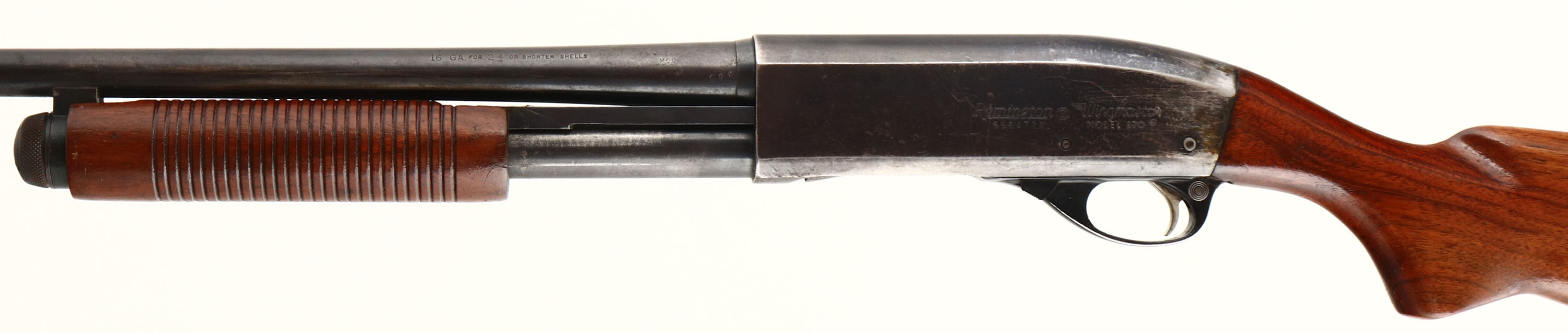 Remington, Model 870 Wingmaster, CAL: 16 GA, MFG: 1957, SN: 556472W, Pump Action Shotgun, Choke: MOD, 28'' barrel. The refinished flat pistol grip wood stocks are very good, displaying light scrapes to the finish. The metal blue finish rates 50%, 40% on the receiver, with areas worn to gun metal gray & starting to tone to a brown patina. Bore is very good. The barrel holds a single front bead. Stock carries a ventilated recoil pad. FFL or C&R Req. - Value: 150 to 300