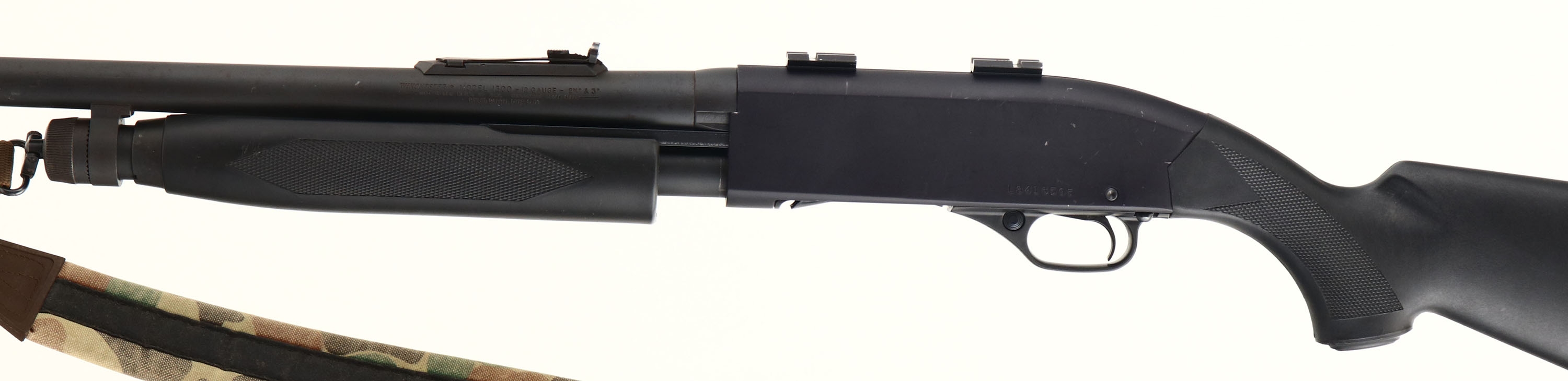 Winchester, Model 1300 Slug Gun, CAL: 12 GA SLUG, MFG: 1978-2006, SN: L3416595, Pump Action Shotgun, 22'' barrel. The checkered, capped pistol grip synthetic stocks are excellent, displaying a couple of minor scratches & dings. The matte black metal finishes rates 95% overall. Bore is excellent. The barrel holds an adjustable rear sight & ramped blade front sight The receiver holds a set of scope mounts. Buttstock carries a Winchester, ventilated recoil pad. Sling studs, with a camo cloth sling. FFL Req. - Value: 300 to 500