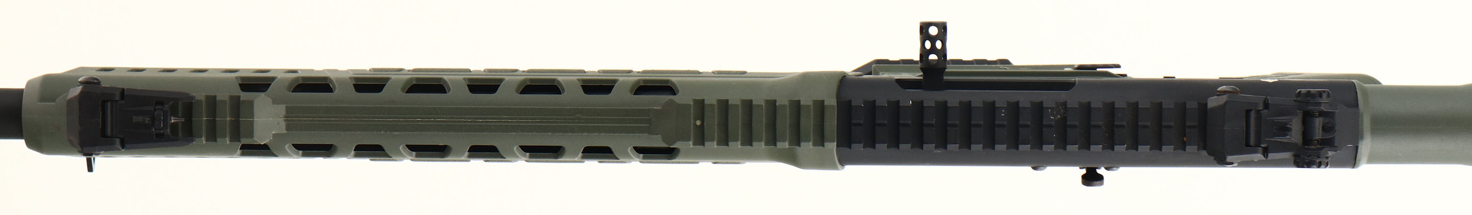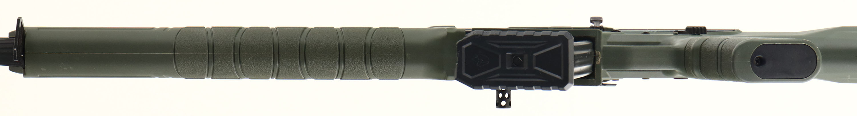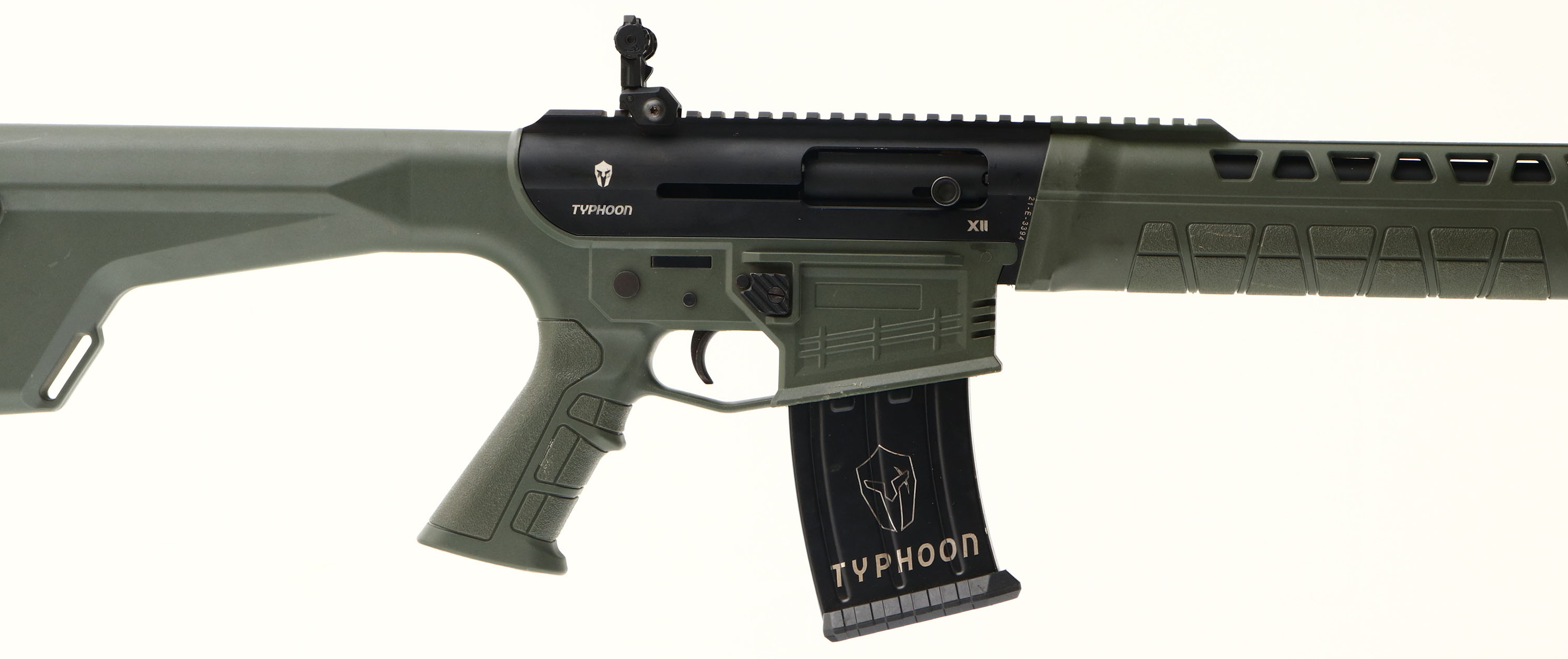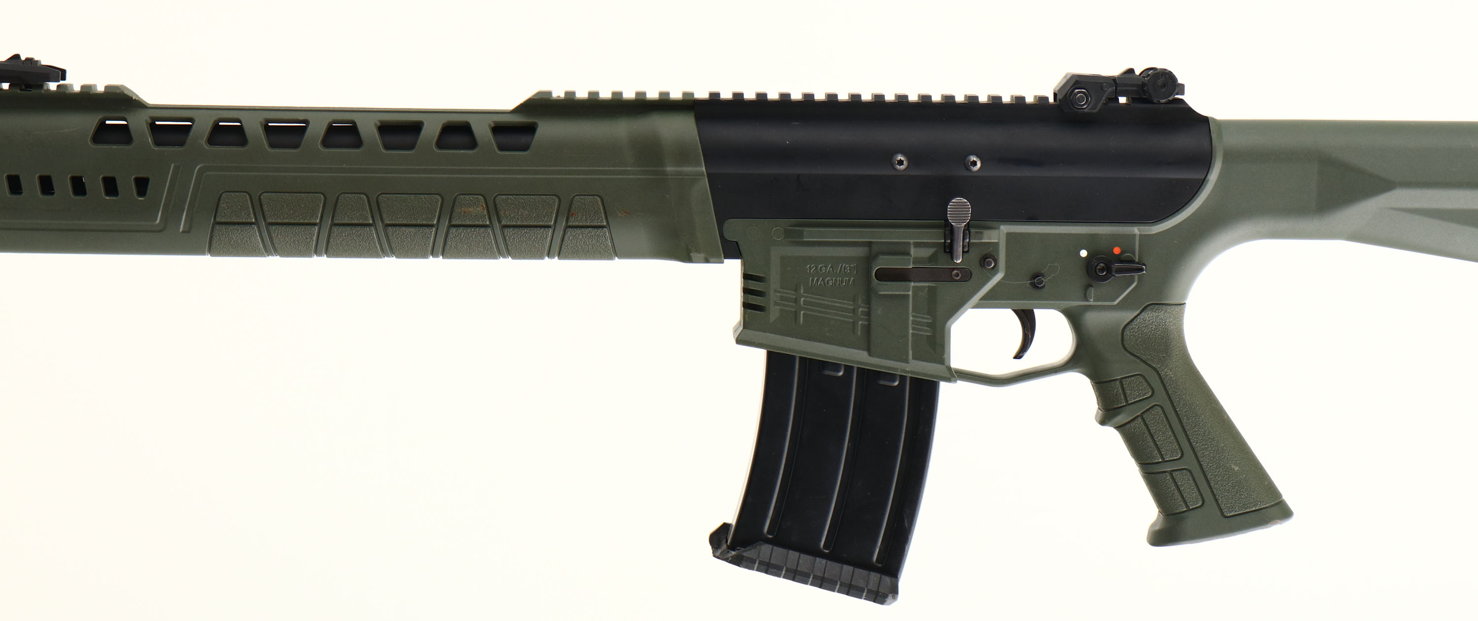 Typhoon, Model XII, CAL: 12GA MAGNUM, MFG: Modern, SN: 21-E-3994, Semi Auto Shotgun, 3'' chamber, 18 1/2'' barrel w/o muzzle brake. The textured grip army green synthetic stock is excellent, displaying minor scratches & scrapes. The matte black finish on the barrel & receiver is excellent, displaying some light use wear. Bore is excellent. The frame has integrated picatinny rails, which hold a set of flip-up sights. Buttstock carries the original grooved, solid recoil pad. Integral sling loop & quick connect docks. The detachable mag has a missing chip from the plastic base. A very good self defense & AR style shotgun. FFL Req. - Value: 400 to 800