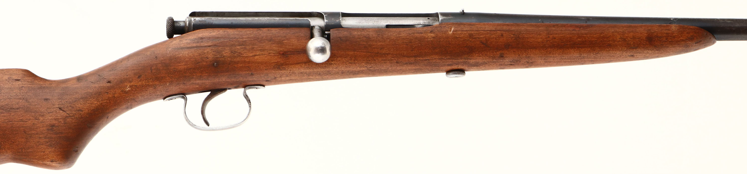 Winchester, Model 41, CAL: .410 GA, MFG: 1920-34, SN: NONE, Bolt Action Shotgun, Choke: F, 24'' barrel. The flat pistol grip wood stock is good, as lightly sanded & reoiled to a flat finish. The stock displays small scrapes, contusions & dings. The metal blue finish has worn to about 30%, with the balance being a mix of thin brown patina & gun metal gray. Bore is excellent. The barrel holds a small fixed rear sight & front bead. Stock carries a worn Winchester checkered buttplate, with edge chipping. A rather neat little bolt .410. FFL or C&R Req. - Value: 150 to 300