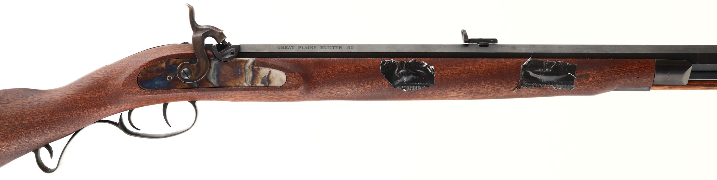 Lyman. Model: Great Plains Hunter. Cal: .50. MFG: modern. S/N: A602080. Percussion Muzzleloader. 32'' octagonal barrel. The straight wrist cheeked wood stock is excellent, two pieces of tape on right side of stock. The metal finish rates 99% overall. Barrel is marked with warning, 'CAL:50'', ''I'' in box, ''MADE IN ITALY-2018 BLACK POWDER ONLY'', S/N, top of barrel is marked ''LYMAN - MIDDLETOWN, CT USA'', right side of barrel is marked ''GREAT PLAINS HUNTER .50''. Bore is excellent. Blade front sight, buckhorn rear sight. Metal buttplate. Comes with ram rod. Muzzleloader No FFL Req. - Value: 100 to 300