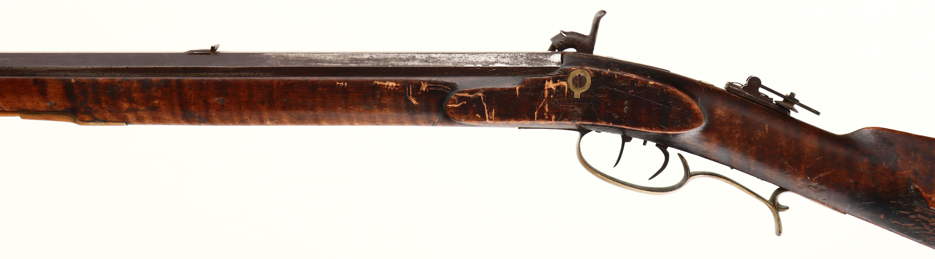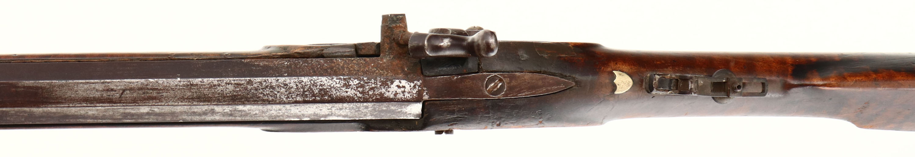 George Goulcher. Model: Kentucky Rifle. Cal: .38. MFG: Mid 1800's. S/N: N/A. percussion muzzleloader. 34 1/2'' octagonal barrel. The straight wrist cheeked wood stock is good with crack on top right side by hammer, cracks on both side by toe, scratches, dents, gouges & wear from use/age. Barrel has toned to a brown patina with rust & pitting near hammer. Bore is good, dark with strong rifling. Hooded post front sight, U-notch & tang flip up aperture sight, brass buttplate. Comes with ram rod. Muzzleloader No FFL Req. - Value: 100 to 300