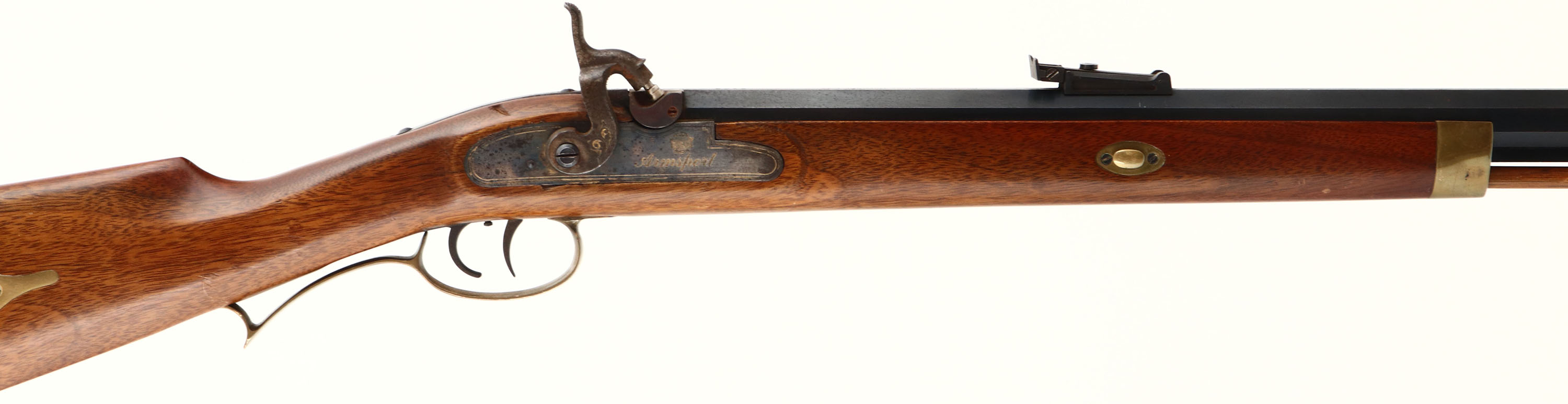 Armsport Inc., Muzzleloader, CAL: 50, MFG: N/A, SN: 35870, Percussion Black Powder Rifle, 28'' octagon barrel. The cheeked straight grip wood stock is very good, displaying nicks, dings & scrapes to the finish. The metal blue finish rates 80% overall, with spotting & speckling, toned to a brown patina. The side plate is case-colored, with case-colors remaining & spotting, toned to a brown patina. Bore is good & bright, with intermittent spotting. The barrel holds an adjustable rear sight & brass blade front sight. Stock carries a crescent brass buttplate. Ramrod present. Black Powder, No FFL Req. - Value: 100 to 300