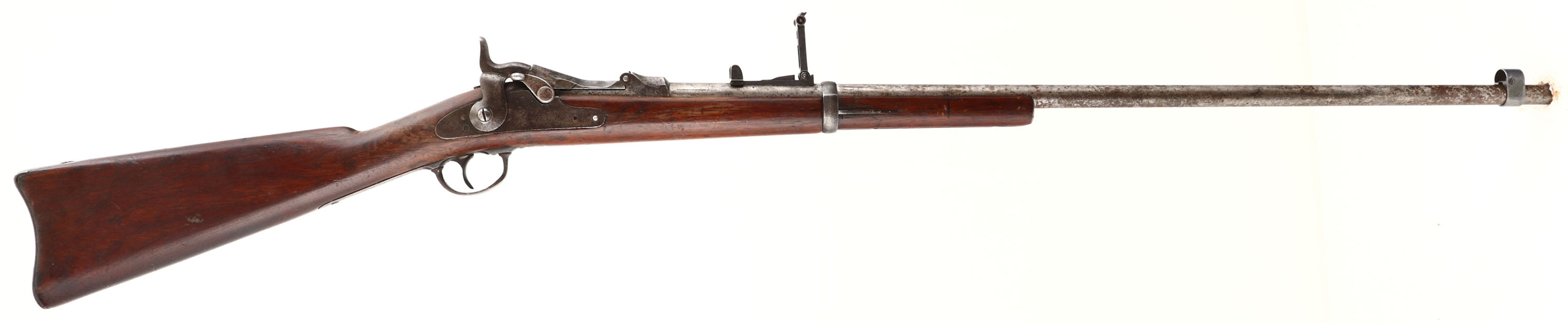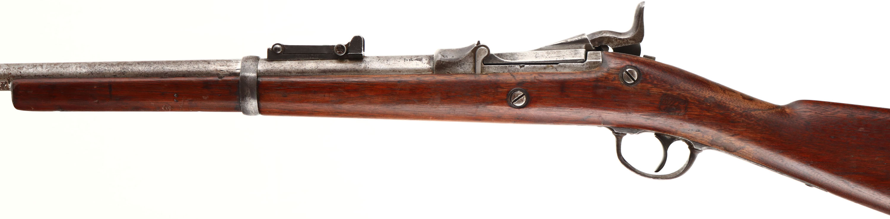 Springfield. Model: 1873. Cal: 45-70. MFG: 1883. S/N: 216284. Trapdoor Breech loader. 32 1/2'' Barrel. The straight wrist wooden stock is good, stock has been cut down, tight repaired crack at top of wrist that wraps around stock towards the receiver. Scratches, chips, dings, dents & wear from use/age, ''P'' in circle Cartouche on bottom of stock behind . Metal finish remain in protected areas with rest of metal worn to a gun metal gray or brown patina with rust speckling. Rear of receiver is marked with S/N, top of breech block is marked ''U.S. MODEL 1873'', left side of barrel is marked ''V'', ''P'' over eagle, ''P''. Bore is good with one spot of light pitting & light roughness. Hooded blade Front sight, V-notch tangent rear sight marked 100 to 6. Metal buttplate that's worn to a brown patina & has cleaned pitting, upper tang marked ''US''. No sling swivels. Antique No FFL Req. - Value: 200 to 400