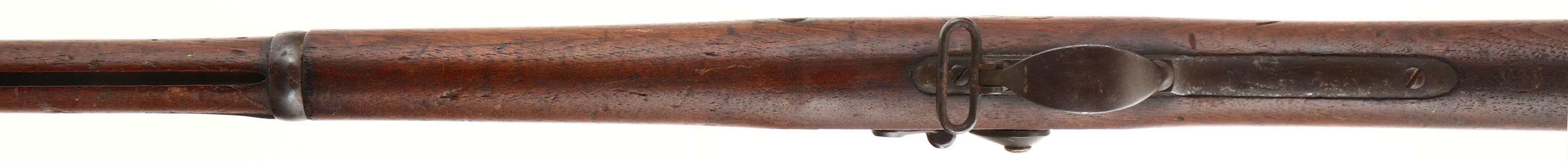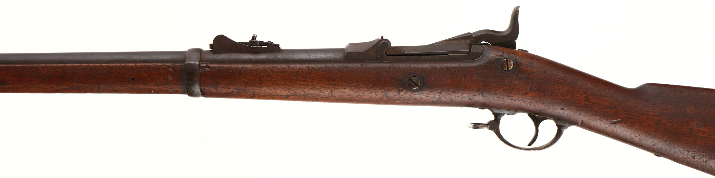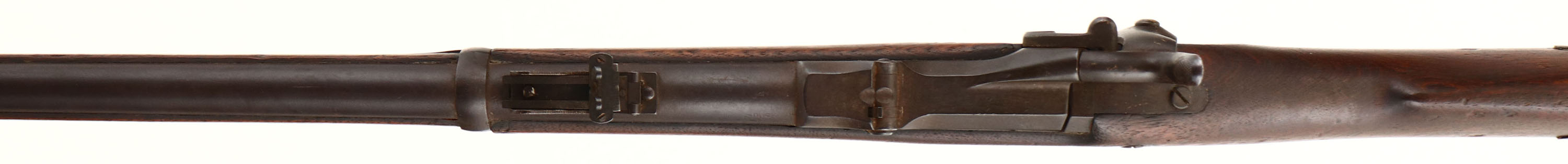 Springfield. Model: 1873. Cal: 45-70. MFG: 1883. S/N: 203667. Trapdoor breech loader. 32 1/2'' Barrel. The straight wrist wood stock is very good, two nails through stock that look to have used to hold in plaque on both sides, scratches, dents, gouges, chips & wear from use/age, ''JAM'' carved into left side of stock, ''P'' in circle cartouche on bottom of stock behind lower tang, Faint cartouche on left side of stock above trigger. All metal parts are worn to a even brown patina with rust speckling. Lock is marked with eagle, ''U.S. Springfield'', top of breech block is marked ''MODEL 1873'', rear of receiver is marked with S/N, left side of barrel is marked with ''V'' over ''P'' over Eagle, ''P'', both barrel bands marked with ''U''. Bore is fair with pitting & worn rifling. Front blade sight, Rear U-notch tangent sight. Metal buttplate worn to a even brown patina marked ''US'' on upper tang. Bottom sling swivel & stacking swivel, missing cleaning rod. Antique No FFL Req. - Value: 400 to 1000