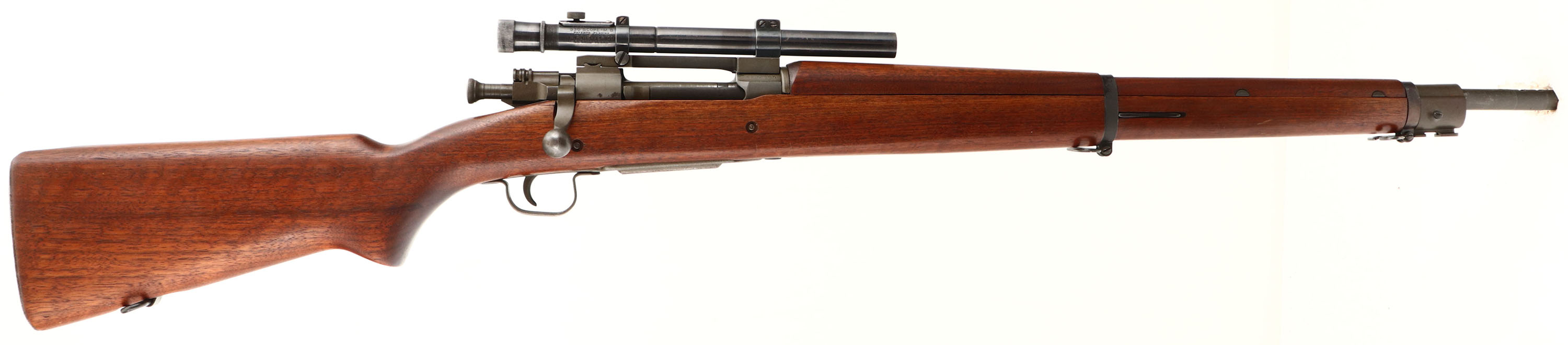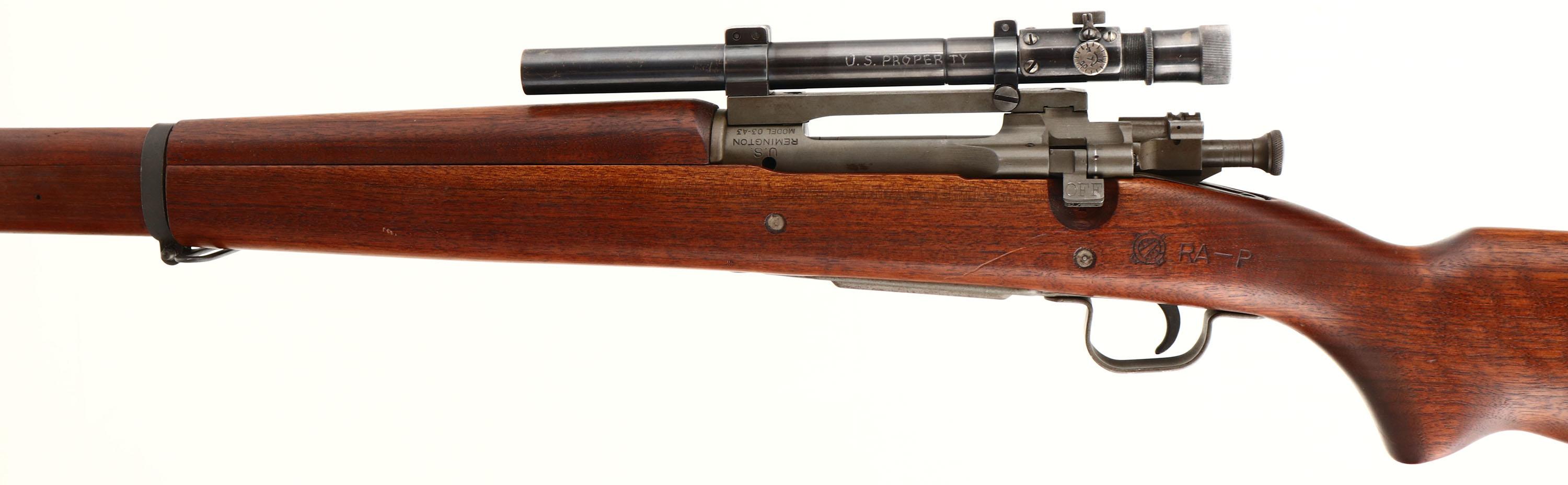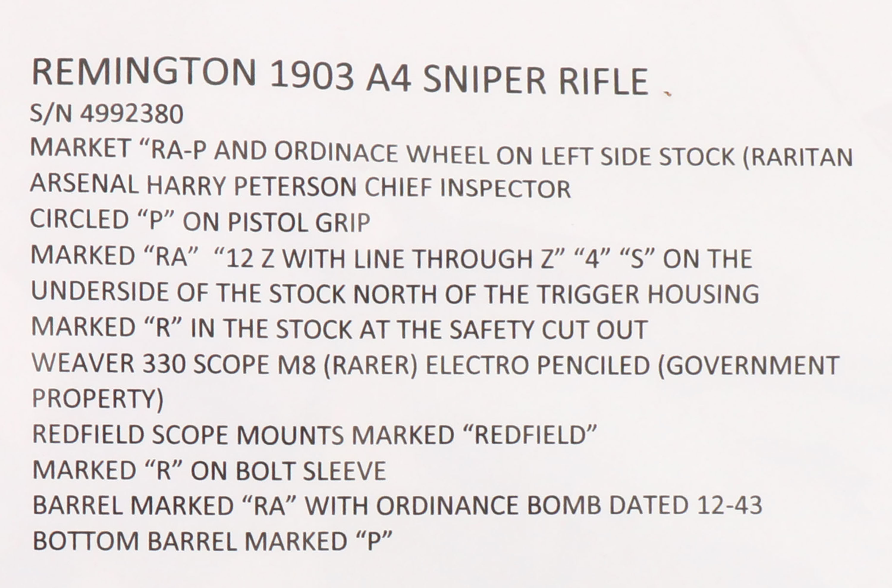 Remington. Model: 1903 A4 Sniper. Cal: 30-06. MFG: 1943. S/N: 4992380. Bolt action Rifle. 24'' round barrel. The replaced semi-pistol grip wooden stock is excellent with excellent finish & one light scrape on left side. There multiple replica cartouches stampings on the stock, left side is stamped with crossed cannons ''RA-P'', ''P'' in circle on bottom behind trigger guard. In front of magazine stamped ''RA'', ''1 2'', ''Z'' with line through & three dot in box & ''4 S''. Barrel & receiver retains 90% parkerized finish, with very light wear. Bolt is parkerized rather than blued. Top front of receiver is marked ''U.S.'', ''REMINGTON'', ''MODEL 03-A3'', S/N. Top of barrel out at muzzle is marked, ''R A'', Flaming bomb, ''12-43'', Bolt handle & cocking shroud are marked with ''R'', Cocking shroud is marked with ''33'' in circle. Bore is excellent. Mounted with a Weaver 330 M8 scope, with has ''U.S. PROPERTY'' Electro Penciled on left side. Scope mounts marked ''REDFIELD''. No front sight. Sling & stacking loops. Military style trapdoor, worn gun metal gray. Action is tight & appears to function correctly. Excellent overall condition. FFL or C&R Req. - Value: 2000 to 4000