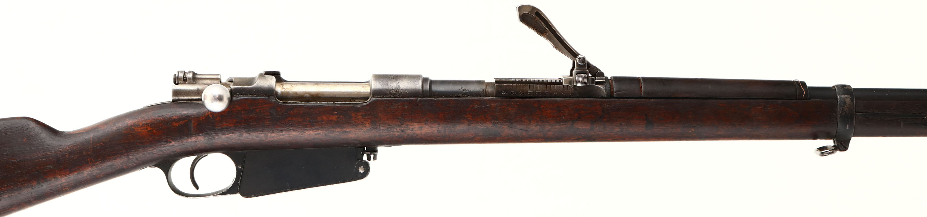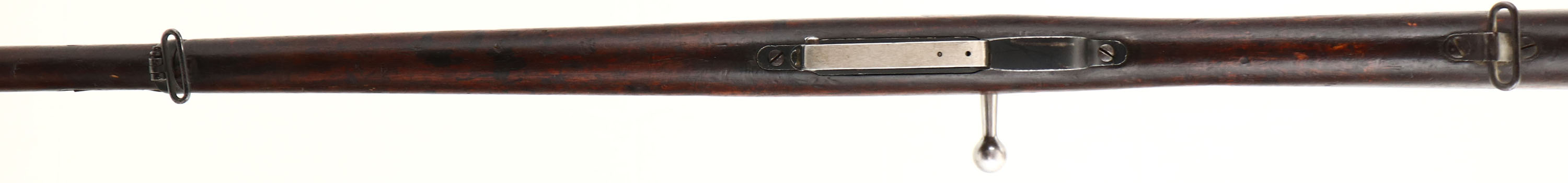 DWM. Model: 1891/12. Cal: 7.65x53mm. MFG: 1900-1909. S/N: W0065. Bolt action rifle. 29'' Barrel. The straight wrist wood stock is very good with scratches, dents, gouges, oil darkening & Wear from use/age, chip in end of upper handguard, one copper wire holding upper handguard has snaped. The metal finish rates 50% on receiver with spots of cleaned pitting at stock line & spots worn to a gun metal gray, The metal finish rates 60% on barrel with spots of wear and pitting under upper handguard. Left side of receiver is marked ''MAUSER MODELO ARGENTINO 1891'', ''DEUTSCHE WAFFEN-UND MUNITIONSFABRIKEN'', ''BERLIN'', Top of receiver is marked with Peruvian Coat of arms, ''REPUBLICA PERUANA'', Right side of receiver is marked with S/N, S/N Matched Bolt. Bore is very good light roughness with crisp rifling. Missing front sight, Lange-Vizier Rear sight marked 4 to 20. Metal buttplate. Bottom sling swivels, Comes with bayonet & sheath. FFL Or C&R Req. - Value: 150 to 300