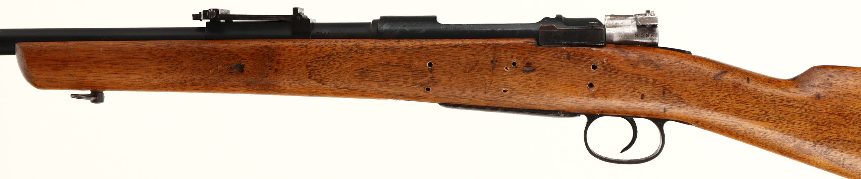 Spanish Mauser. Model 1893. Cal: 7x57mm. MFG: 1896-1943. S/N: 2666. Bolt action rifle. 22'' Barrel. The straight wrist wooden stock is good, stock has been cut down, holes drilled in stock on left side by magazine, small chip at toe, stock has scratches, dents, gouges & wear from use. The Metal has been Re-finished with a black paint, paint has worn away in spots to show original finish underneath. Left side of receiver is marked with S/N, ''MAUSER ESPANOL MODELO 1893'', Left side of barrel is marked with S/N, ''7MM''. Bore is good, roughness with thinned rifling. No Front sight, V-notch ladder rear sight marked 4 to 20. Metal buttplate with wear & brown patina. Bottom sling swivels. FFL Or C&R Req - Value: 100 to 200